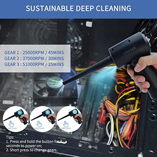 - 3-Speed Adjustment: Press and hold the power button for 3 seonds to turn on/off the ompressed air duster. Air duster has 3 speed wind speeds (200RPM, 300RPM, RPM). Short press swith an swith to three wind speeds. This is pratial and simple.