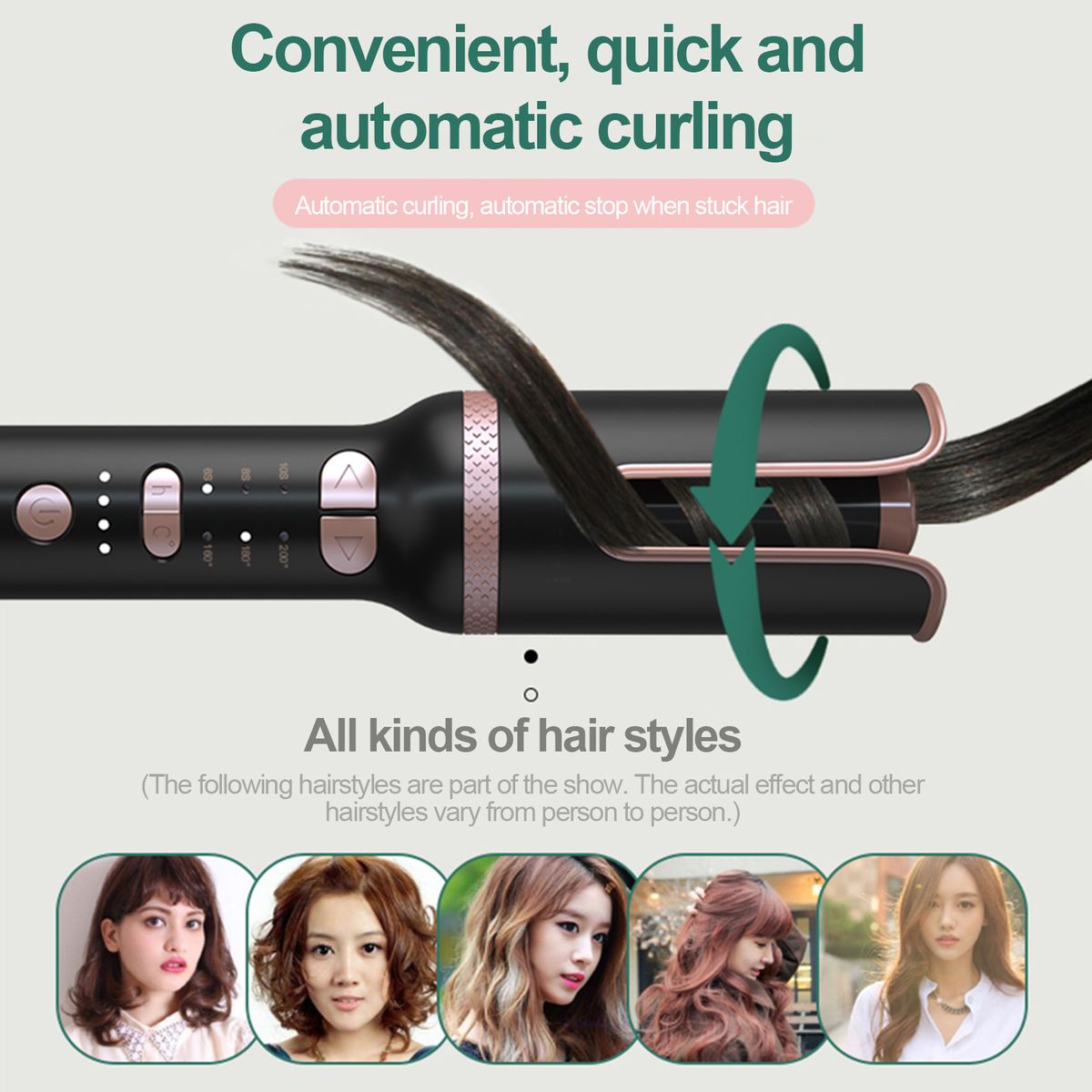 3 temperature selections(160-200℃), 6-10s auto curling timers, as well as curling direction (left and right) together allow to meet the needs of different hair quality and form perfect curl easily.