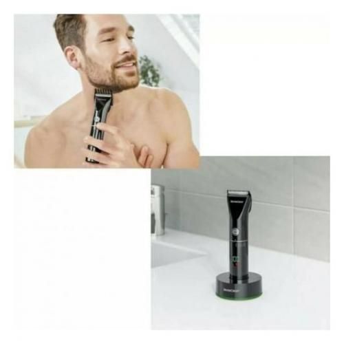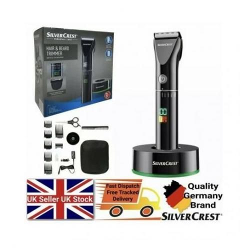 CORDLESS HAIR& beard trimmer. 5in 1 with attachments to cut' clip contour, trim and shave. Precision- ground stainless steel blades. Adjustable via sliding control -for precise hair and beard trimming. Battery or mains operation with Direct drive function. 4 comb attachments for cutting hair 3/6/9/12 mm. Precision trimmer for shaping moustaches eyebrows and sideburns. Comb attachment for trimming beards (3/4/5/6mm. Attachment for trimming nose and ear hair. Shaving attachment with spring-loaded blade. Rapid charging:90 minutes. Up to 60 minutes of operation when fully charged. LED symbol indicate battery capacity and charging status Mains adapter with universal voltage adjustment (100-240-) With travel lock- prevents accidentally switching on e.g when travelling. Includes scissors. : comb. :blade oil. Mains adaptor. Charging base Cleaning brush and storage pouch. Rechargeable Li-ion battery:500mAh/3.7v5-in-1: with attachments to cut, clip, contour, trim and shave