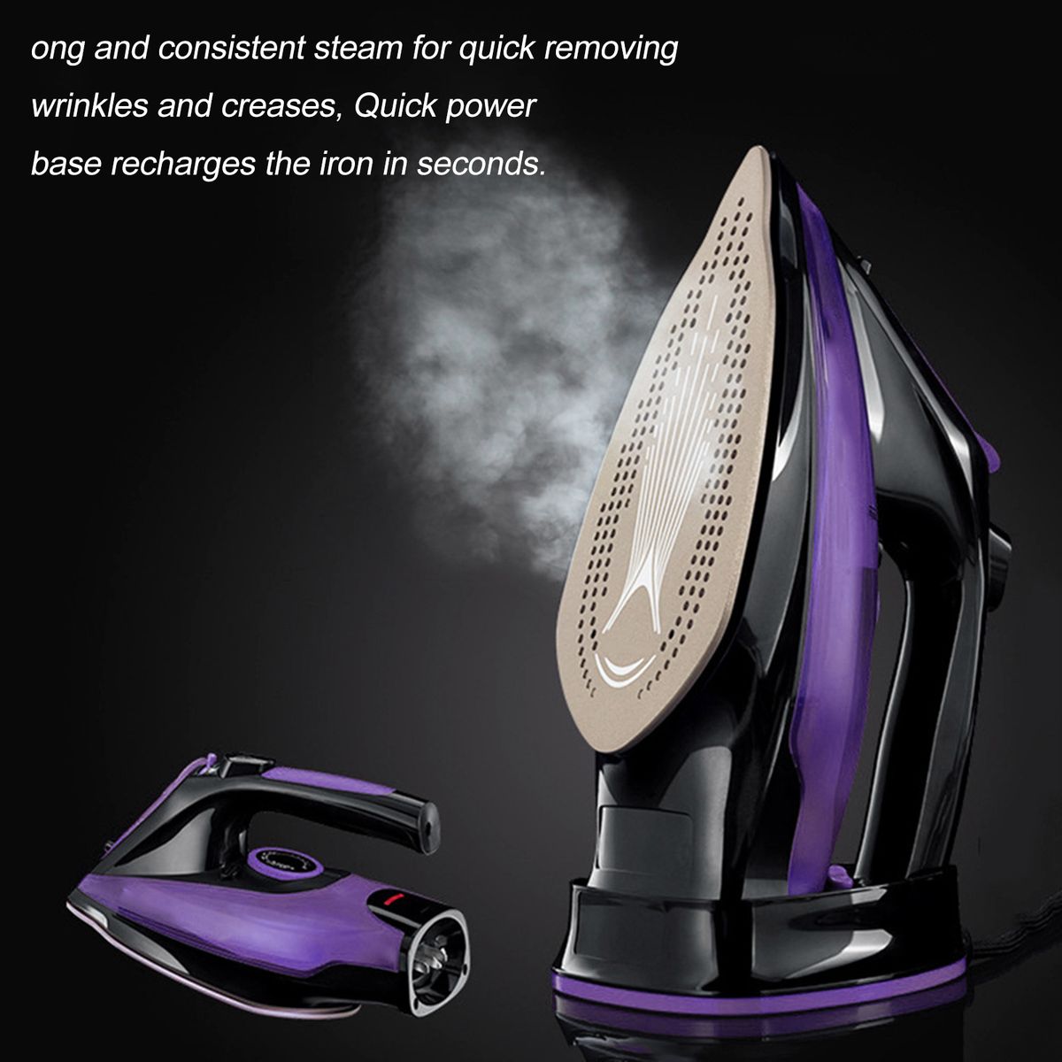 Powerful Steam Iron: Super hot 2400W steam iron heat-up in 5 seconds, delivers a strong and consistent steam for quick removing wrinkles and creases, Quick power base recharges the iron in seconds. Indicated light indicates when the iron is ready to use and reminds you when you need to recharge.