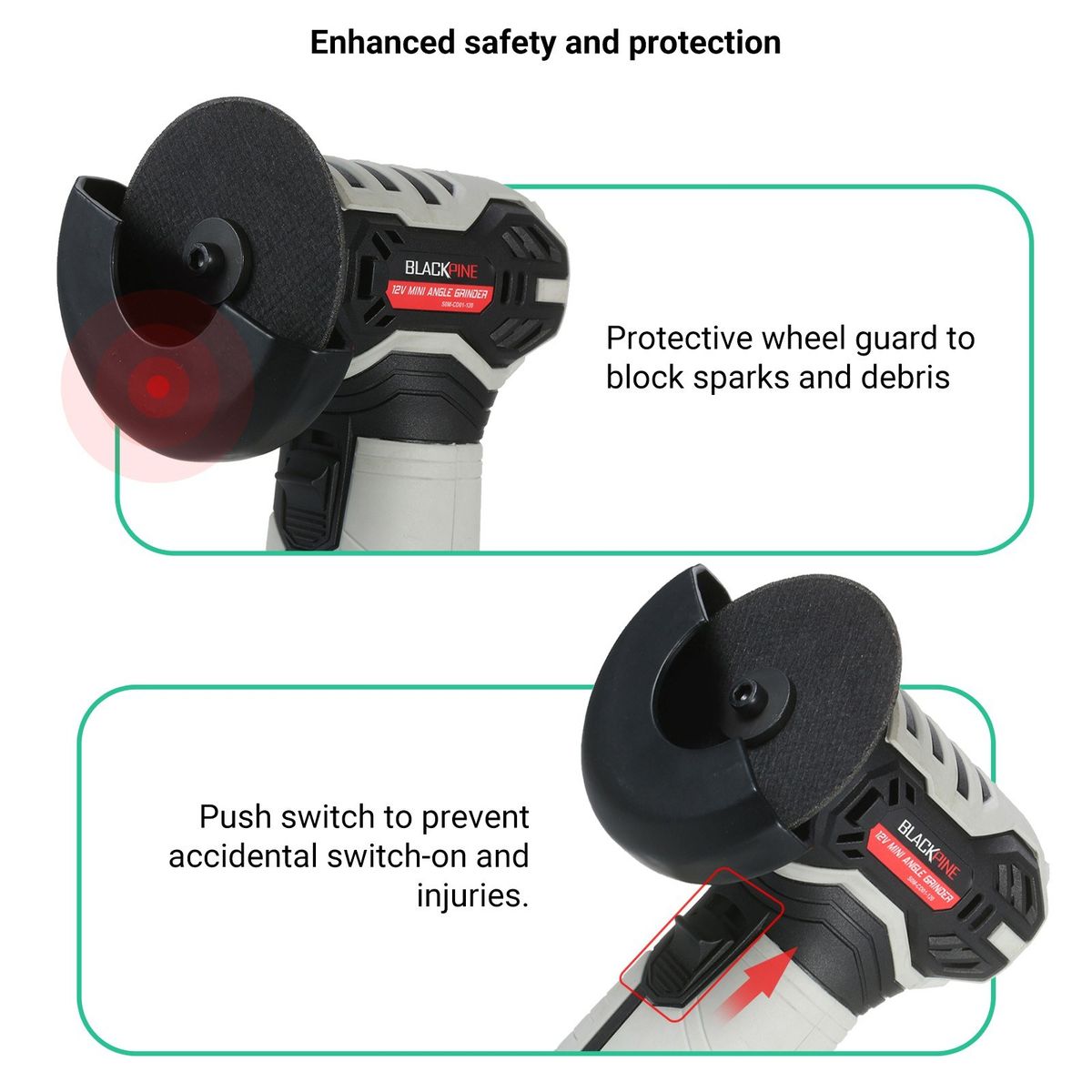 Enhanced safety and protection - this device is also fitted with a protective wheel guard to block sparks and debris, and the push switch is designed to prevent accidental startups and injuries.