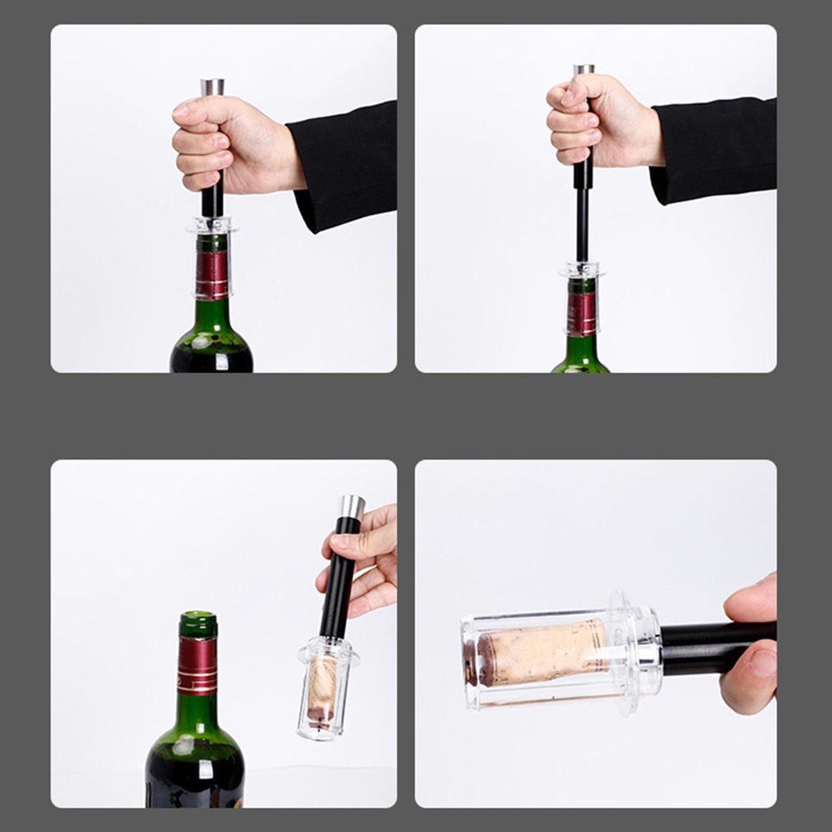 【Easy to open】The air pressure pump opener,Cut the sealed tinfoil of the bottle mouth and fully insert the corkscrew, pull the handle up and down to restart and stabilize the bottle (do not press the protective cover), the cork will push out the air pressure, and the cork can be taken out by turning the scribe.