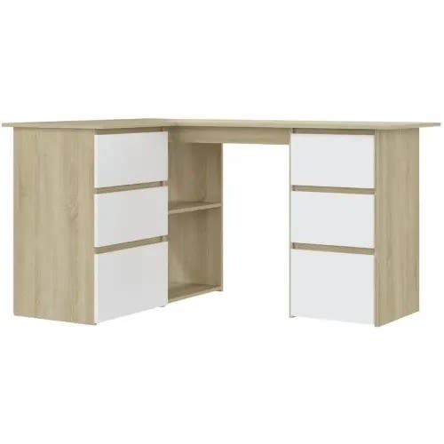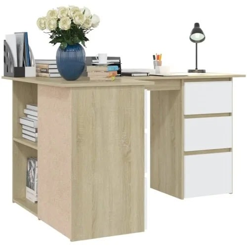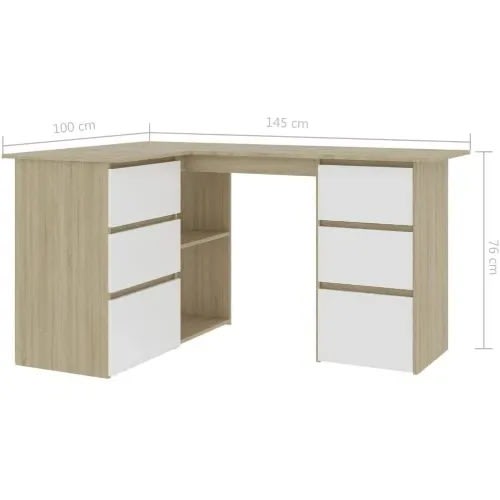 This L-shaped design and modern style make this an ideal anchor for your home office. The Farm Oak finish and sturdy metal frame is durable and stylish. The accessory drawer and under desk storage keep bins, books and office supplies organized and accessible.