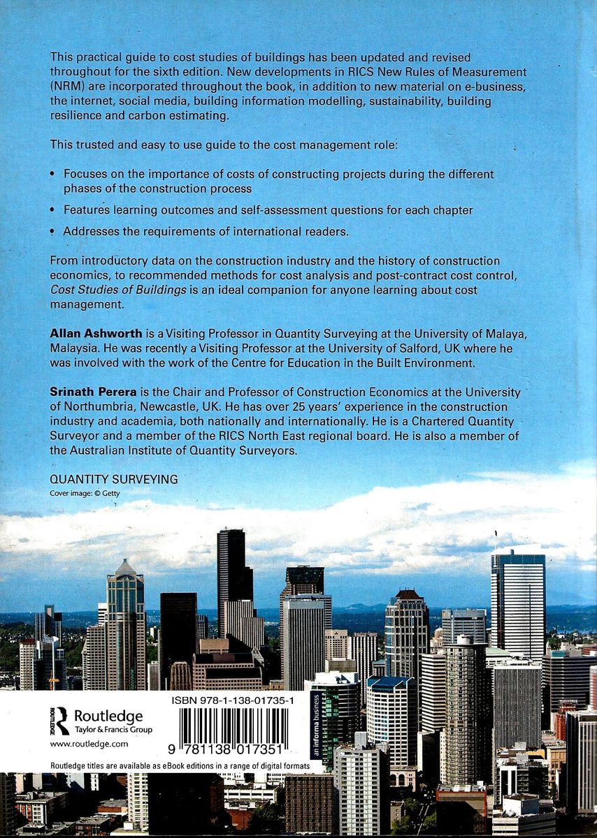 This practical guide to cost studies of buildings has been updated and revised throughout for the 6th edition. New developments in RICS New Rules of Measurement (NRM) are incorporated throughout the book, in addition to new material on e-business, the internet, social media, building information modelling, sustainability, building resilience and carbon estimating.