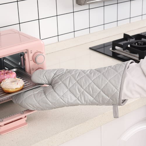 The oven mitts the surface layer is made of Silver coating, which makes it comfortable to wear, a pleasant grip and is gentler on the skin.Use to hold hot pots, pans, plates, bowls and trays, and also place any hot item straight from the stove top, microwave or oven onto the pot holder. Make the most of your imagination using it.Each oven mitt features a cotton loop inside so they can be hung in a cabinet, near the grill or in a pantry.Package included1* Pair oven mitts