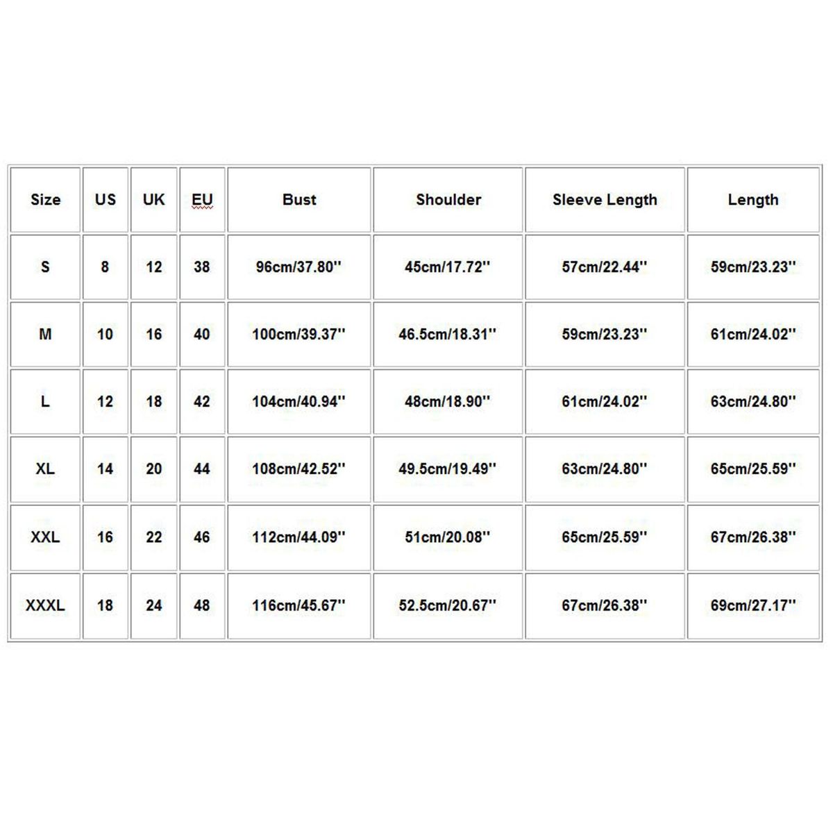 Size: XXL US: 16 UK: 22 EU: 46 Bust: 112cm/44.09'' Shoulder: 51cm/20.08'' Sleeve Length: 65cm/25.59'' Length: 67cm/26.38''