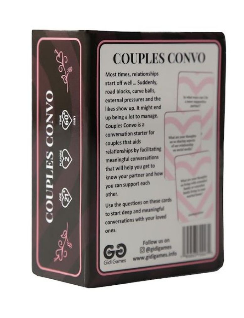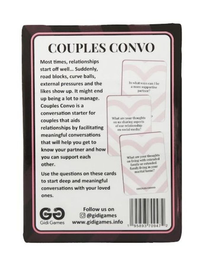 Couples convo is a conversation starter deck of 100cards made specifically for couples who wants to spend some good quality time together, having good conversation and even getting to know each other better through conversation. Each card has a topic for a new conversation so it is fun all way. Game play is very simple and straight forward. Each partner gets a turn to pick and ask the other the question on the card and the convo begins. As a couple, do you want to know each other better? or it is just a bit difficult to have fun, long conversation at a go? or you just want to have some alone time fun? Couples convo is for you. To summarize, Couples convo is the ultimate conversation for couples or intending couples. The deck has the following features:-100 cards-Each card has a couple conversation question-Game is to be played by two players-A typical game last over 60minutes- Be sure to be a good listener and listen to what your partner has to say-Build a long lasting relationship today.
