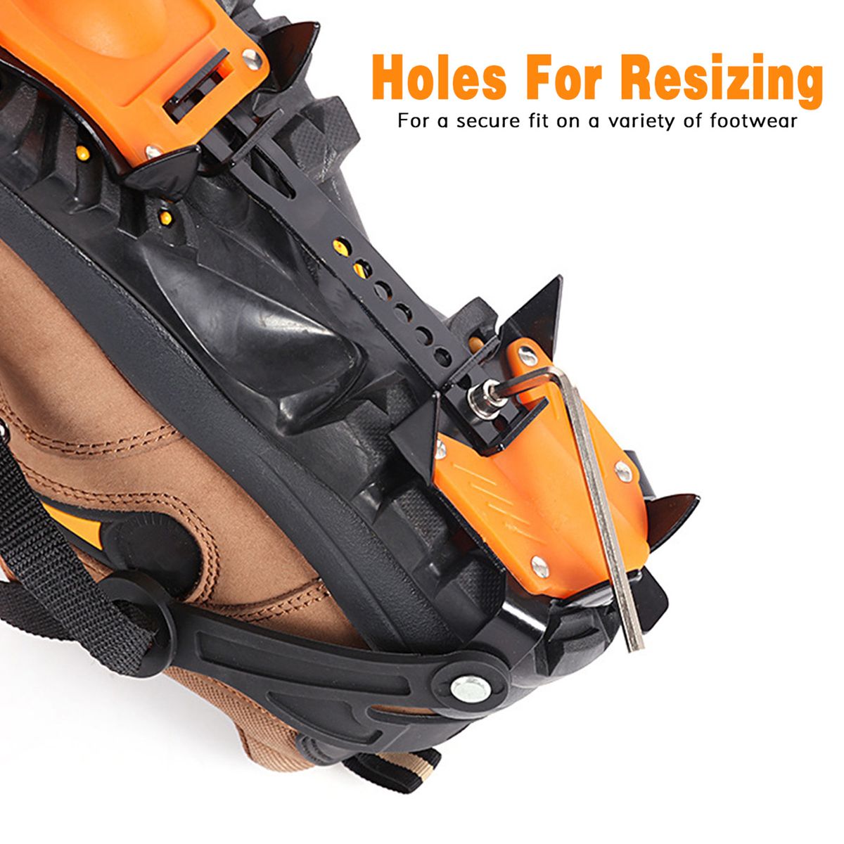 Holes and straps for resizing to tightly attach to boots of different sizes.
