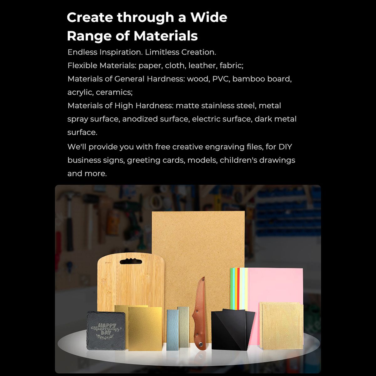 Supported Material: Cardboard, Wood, Bamboo, Rubber, Leather, Fabric, Plastic, Etc.