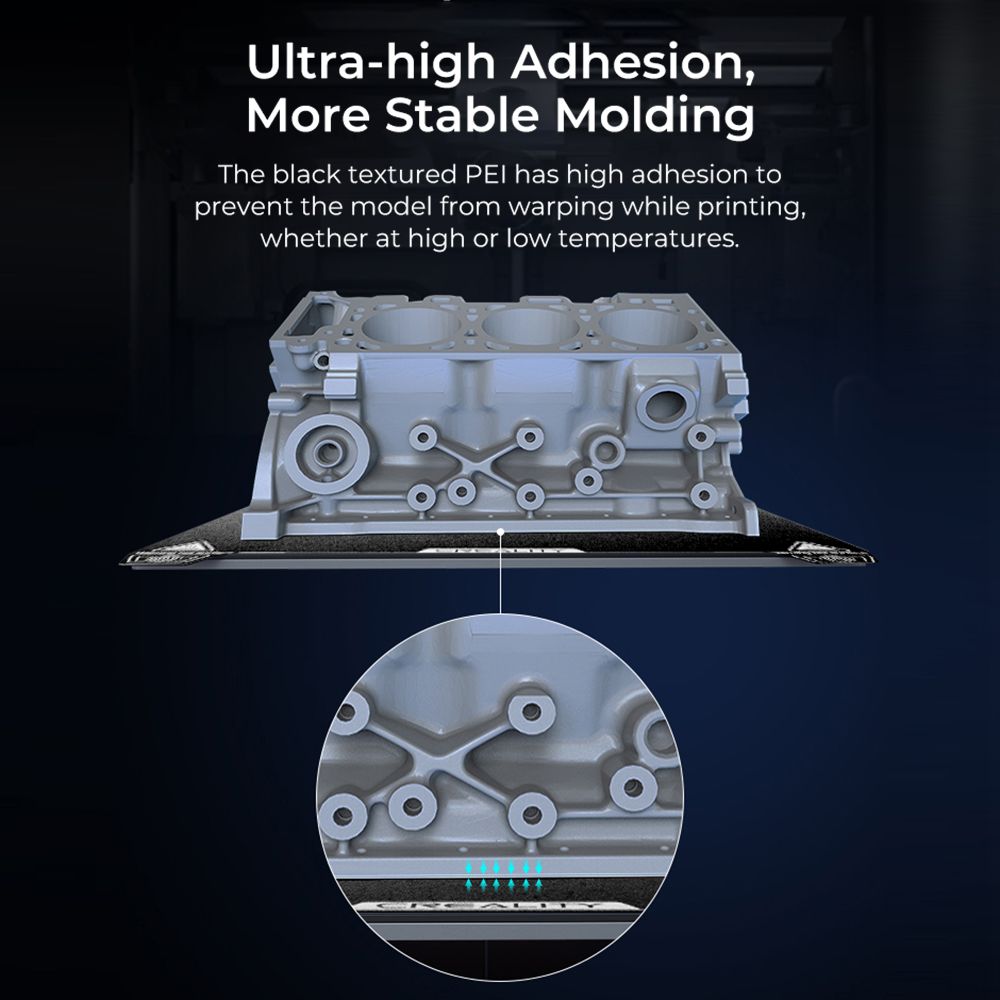 Ultra-high Adhesion, More Stable Molding: The black textured PEI has high adhesion to prevent the model from warping while printing, whether at high or low temperatures.