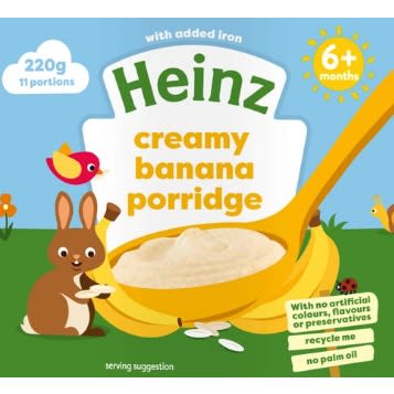 Milled corn, rice and banana porridge with milk. The smooth texture of our creamed banana porridge makes it suitable as a first weaning food. Our deliciously creamy banana porridge comes in a resealable pack for safe and easy storage, contains added vitamin A, C and D, is gluten-free and contains no preservatives, no added sugar or salt*.