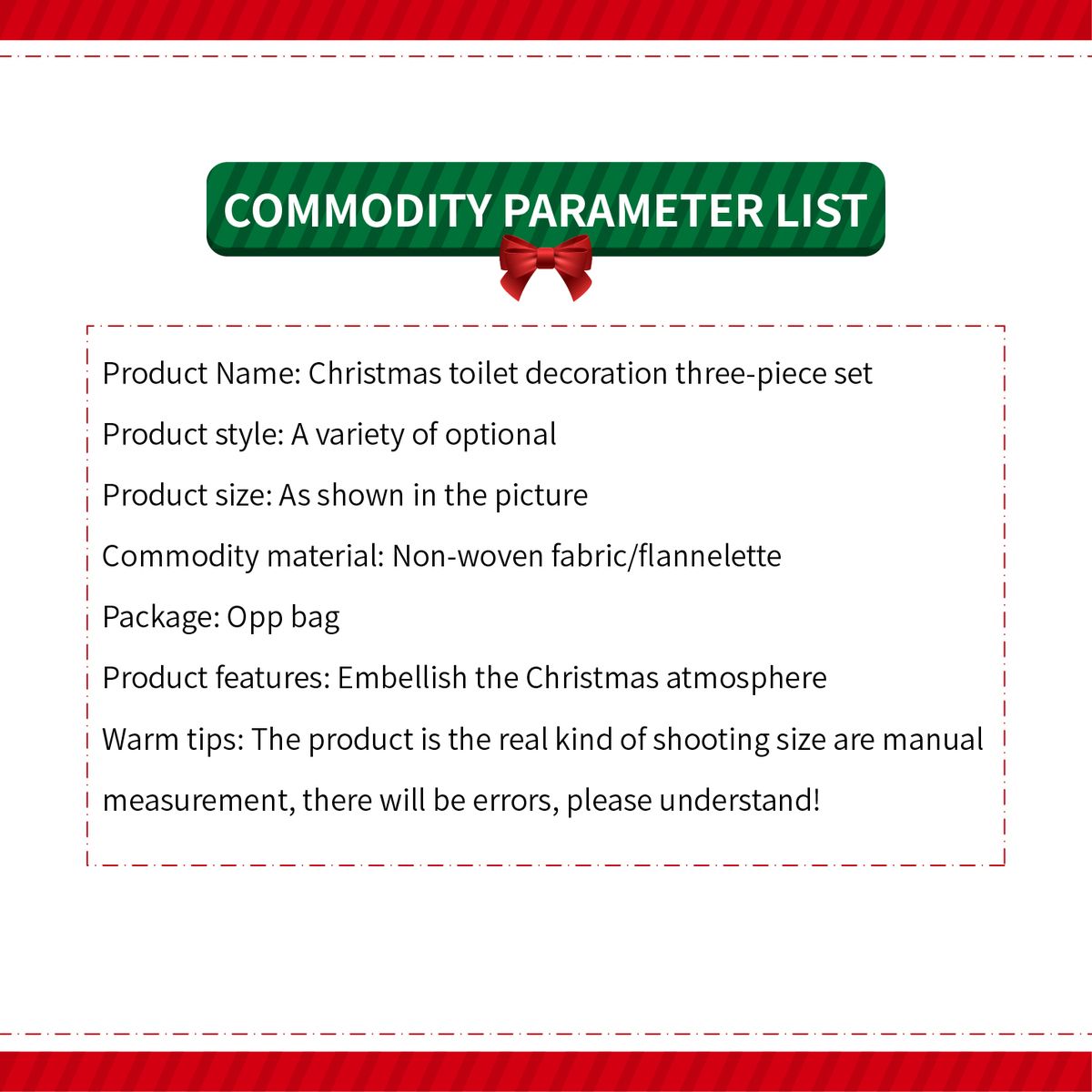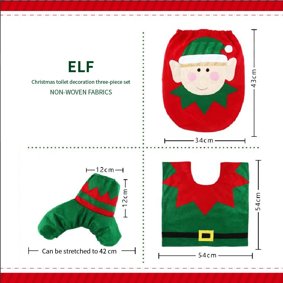 Description:Creative Christmas Elf Toilet Seat Cover Toilet Sets Toilet Clothe Christmas toilet decoration three-piece setCute with a smiley face elf to decorate your bathroom for Christmas holidays,Ornament Christmas atmosphere.Comes with a tank cover with tissue box cover, toilet seat cover, and a bathroom rug.Rug has an anti-slip rubber back while both covers for the toilet and tank have elastic edges for secure.Select high-quality printed fabric, more class!Select cutting, sewing, line leveling!Non-slip treatment on the back.