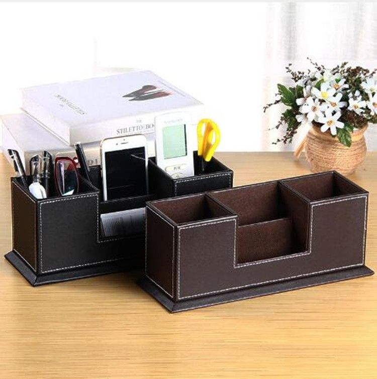 Creative Pen Support Fashion Leather Multifunctional Desktop Office Storage Pen Case Socket Double Pen Holder(Brown)