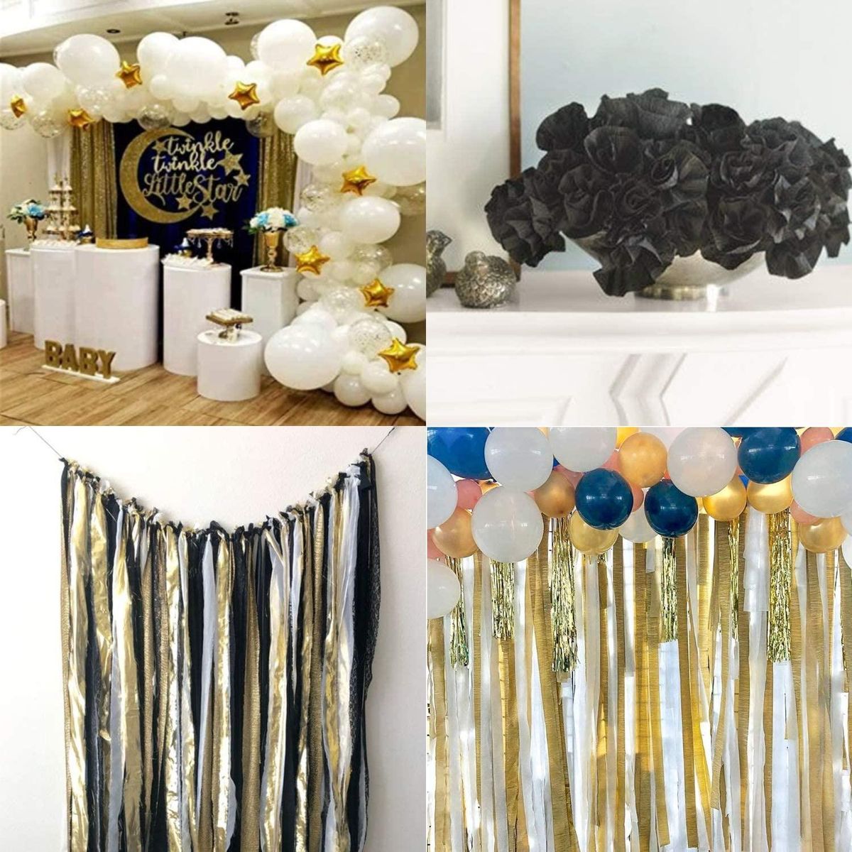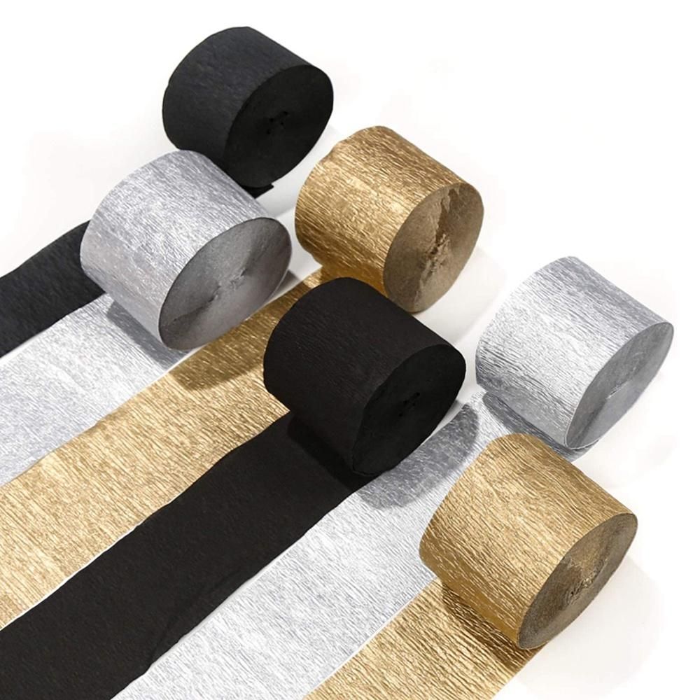 PACKAGE SPECIFICATIONS: The crepe paper package includes black streamers (4 rolls), silver streamers (4 rolls), gold streamers (4 rolls), 12 pieces in total. Each roll of party streamers is 0.15 x 82 feet / 4.5 x 25m (W*L), perfect birthday decorations, wedding decorations, baby shower decorations for girl, gold streamers party decorations
