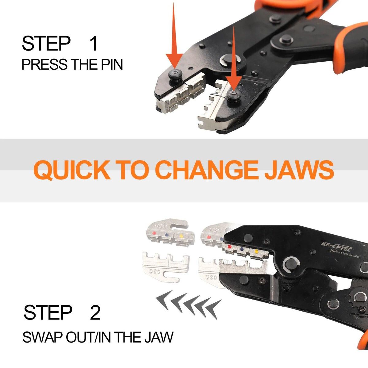 Meet the Expert Crimping Companion - the ultimate answer to all your crimping needs! This toolkit includes a crimping tool with interchangeable crimping heads and 4 diverse crimping die sets, all packaged in a handy storage case. The ratchet crimping tools features a crimping die which is made of powder alloy, providing durable and reliable performance. The ergonomic handle design and compact structure saves 50% energy compared to traditional crimping tools, making it easier to use for extended periods of time. This tool is suitable for a range of crimping needs, including heat shrink, non-insulated terminals, open barrel, insulated and non-insulated ferrules, and OT&UT terminals with a capacity of AWG 20-8 (0.5-10mm² ). Changing out the jaw is quick and simple, with no extra tools required. The components of the ratchet crimping tool are made of special steel and feature a built-in ratchet with a safety release. The crimper height of the star wheel is adjustable to ensure the right amount of crimping force, and the non-slip nylon handle is designed for maximum comfort and efficiency. The integrated self-locking design adds an extra level of safety and convenience.