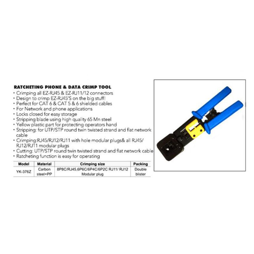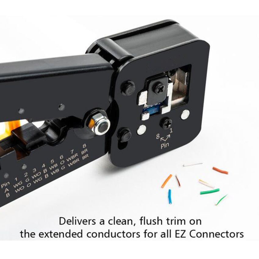 New tool is designed for the professional installer providing a ratcheted, high leverage, stable platform for consistent, repeatable terminations.Zero frame prevents torque loss during the crimping cycle.Tool steel die head assembly provides 360 degree of connector support during , expanded surface area on contact drivers delivers full, uniform force, built-in and stripper for flat and round cable.“ and trim system” delivers a clean, flush trim on the extended conductors for all connectors.Laser marked with wiring guide for proper wire sequence.