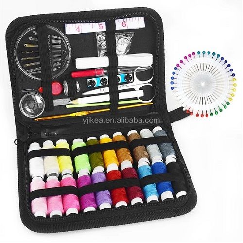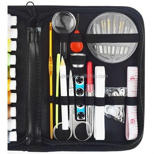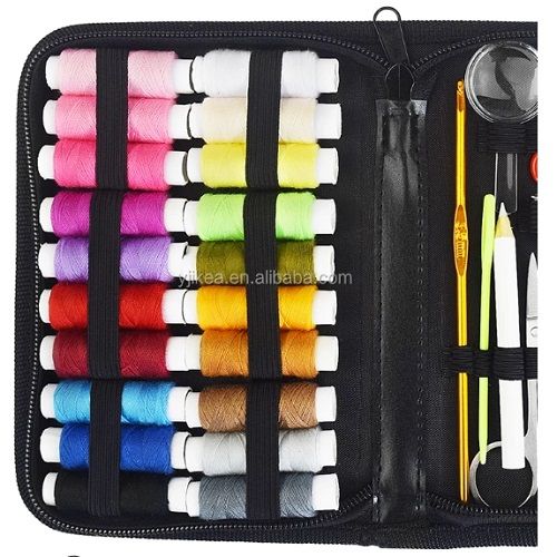 Coil X22Color coil X2Needle insert X1Needle tray 30 needles X1Magnifying glass X1 Needle barrel 5 needles X1Hidden buckle X3White buckle X3Black buckle X3Plastic lead X2Pearl needle X10Large buckle needle X5Stainless steel scissors X1Nail clippers X1Tape measure X1 White pen X1Wire cutter X1Tension device X1Green sweater needle X1 Metal hat thimble X2Eyebrow clip X1Ear pick X1