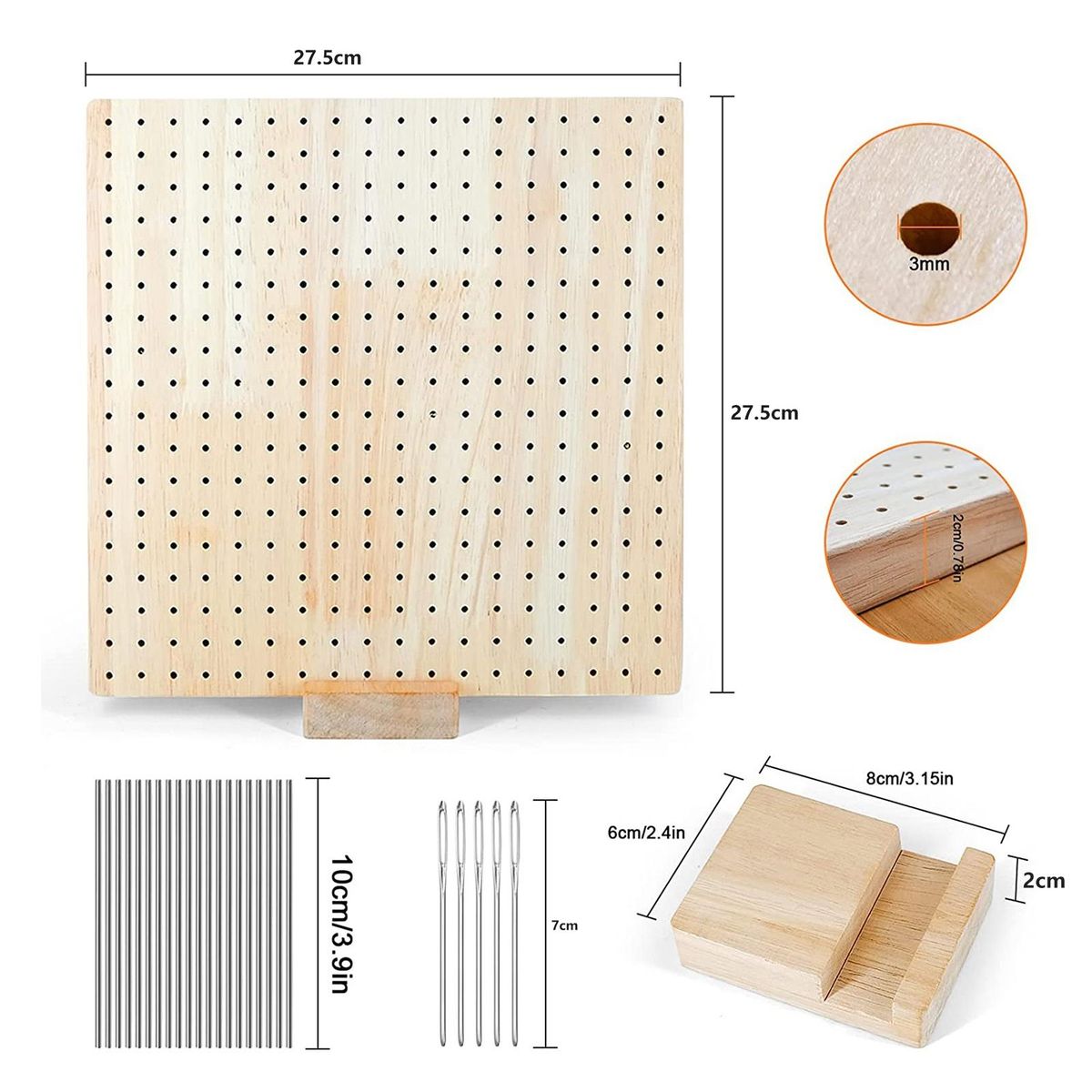 The length of this product is 27.5cm, the width is 27.5cm and the height is 2cm. Solid wood holder allows it to be easily used for different crocheting angles, meaning you can have a comfortable crocheting position without having to weave flat all the time, and it is portable and also perfect for your crocheting work.