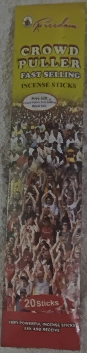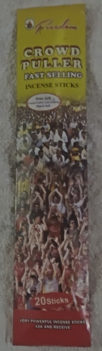 This CROWD PULLER Fast Selling Incense Sticks(FREE GIFT CROWD PULLER FAST SELLING BLACK SALT) has been fortified to bring crown to your business. Customers will gather to buy from you. It has the power to pull crowd to you. Light the incense stick and pray as desired for your heart desired to be met, and your prayer answered. It will bring breakthrough in your business and endeavors This Spiritual incense contains 20 sticks in a pack. The fragrance is very strong and alluring, it can also be used for stress relief, meditation decor. Incenses are popular in every culture,they are natural organic and herbal. It is hand crafted in Indian,using minimal tools and almost no machinery.This CROWD PULLER Fast Selling Incense Sticks has been fortified to bring crown to your business. Customers will gather to buy from you. It has the power to pull crowd to you. Light the incense stick and pray as desired for your heart desired to be met, and your prayer answered. It will bring breakthrough in your business and endeavors This Spiritual incense contains 20 sticks in a pack. The fragrance his very strong and alluring, it can also be used for stress relief, meditation decor. Incenses are popular in every culture,they are natural organic and herbal. It is hand crafted in Indian,using minimal tools and almost no machinery.