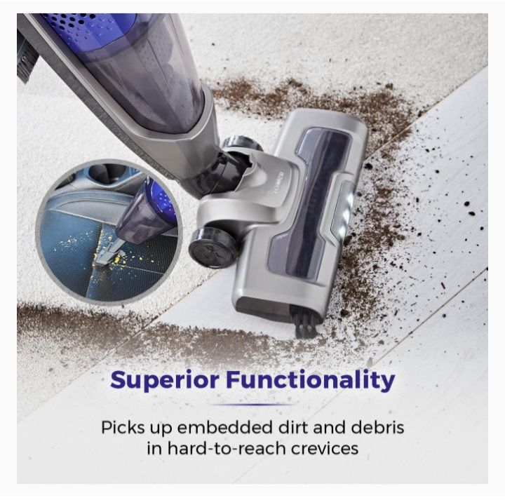 - SUPERIOR FUNCTIONALITY: The strong head has been designed to ensure effortless removal of embedded dirt and debris on carpets and hard floors, whilst the 2-in-1 crevice nozzle makes it easier to clean those tight spaces and tough spots