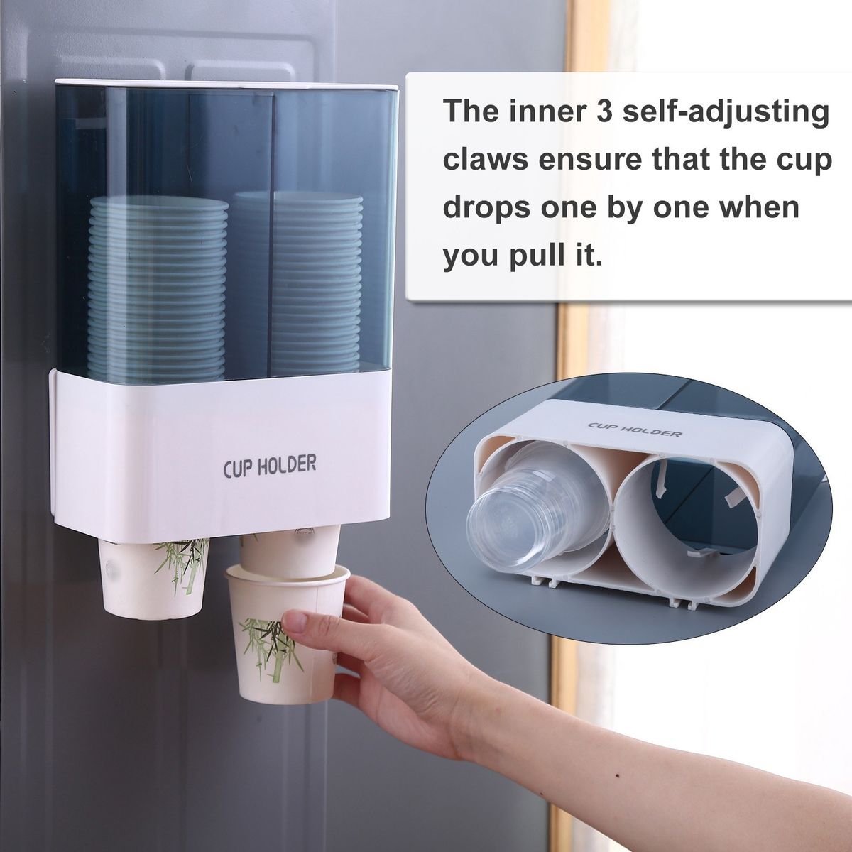 Pull-Type Cup Dispenser: Suitable for disposable cups in plastic or paper. The inner 3 self-adjusting claws ensure that the cup drops one by one when you pull it.