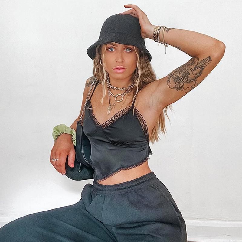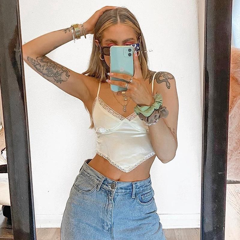 1X Cuteandpsycho-camisola de encaje con espalda descubierta para mujer blusa Sexy de los 90 con cuello en V Top con tirantes finos para discoteca Camiseta corta suave