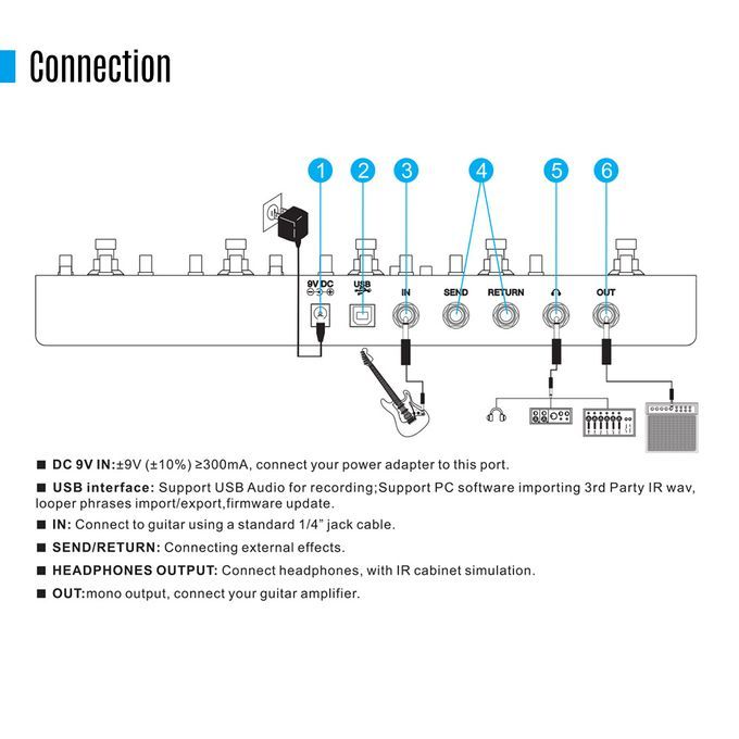 1 x Effect Pedal,1 x USB Cable,1 x Adapter(EU),1 x User Manual(English&Chinese&French&German&Japanese),