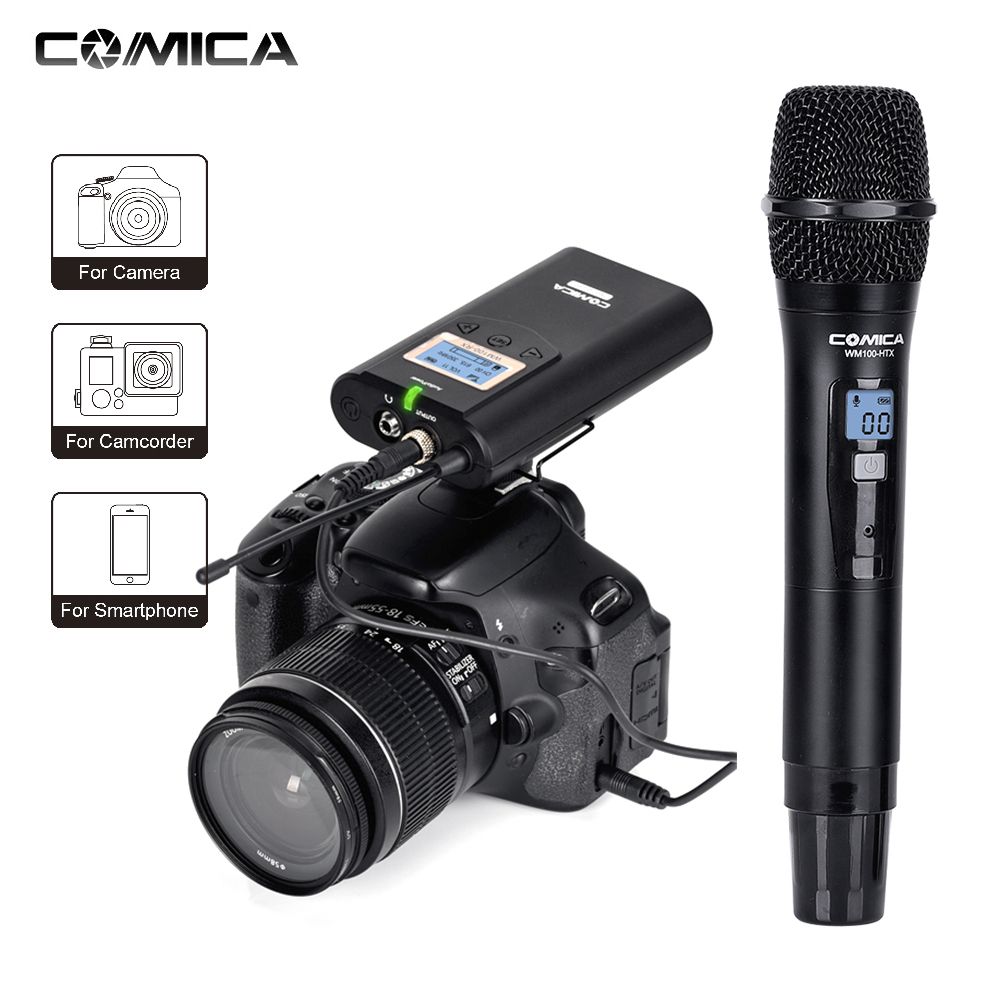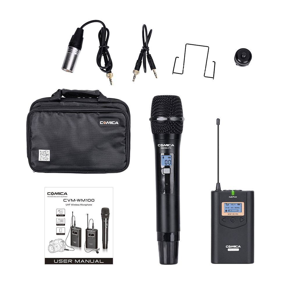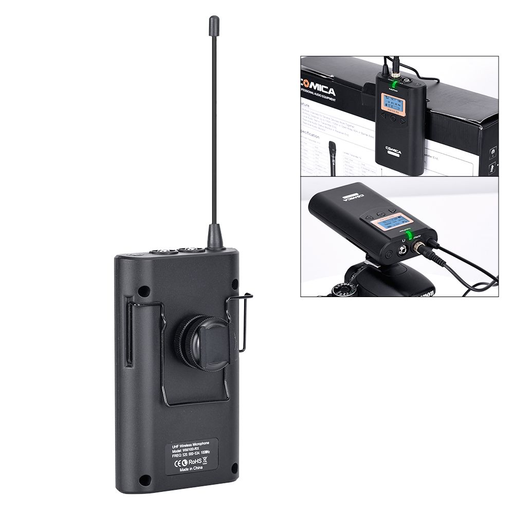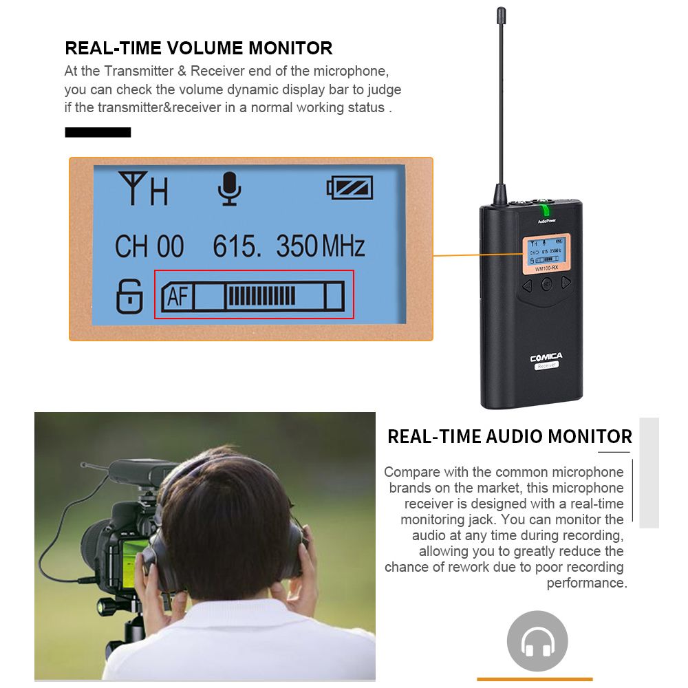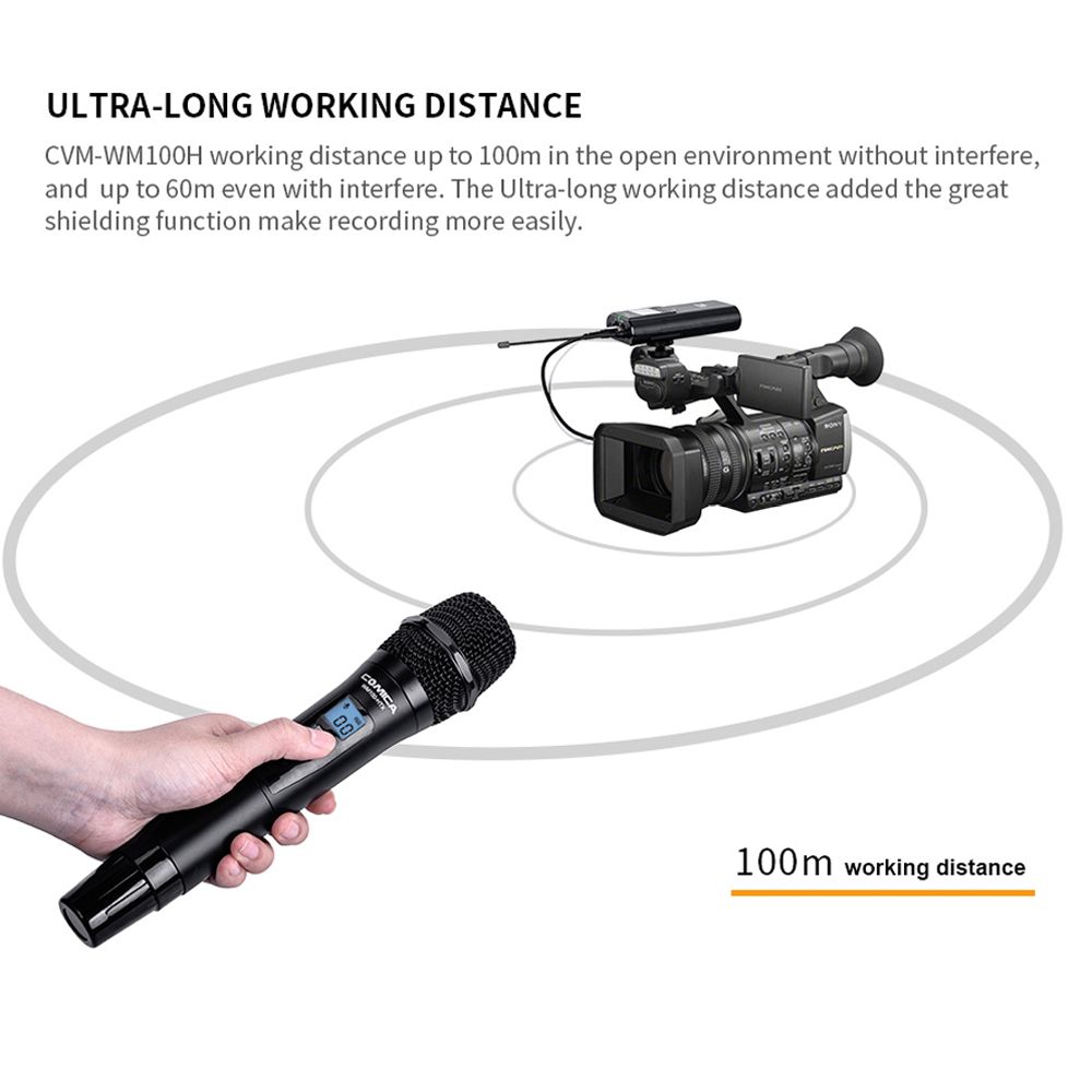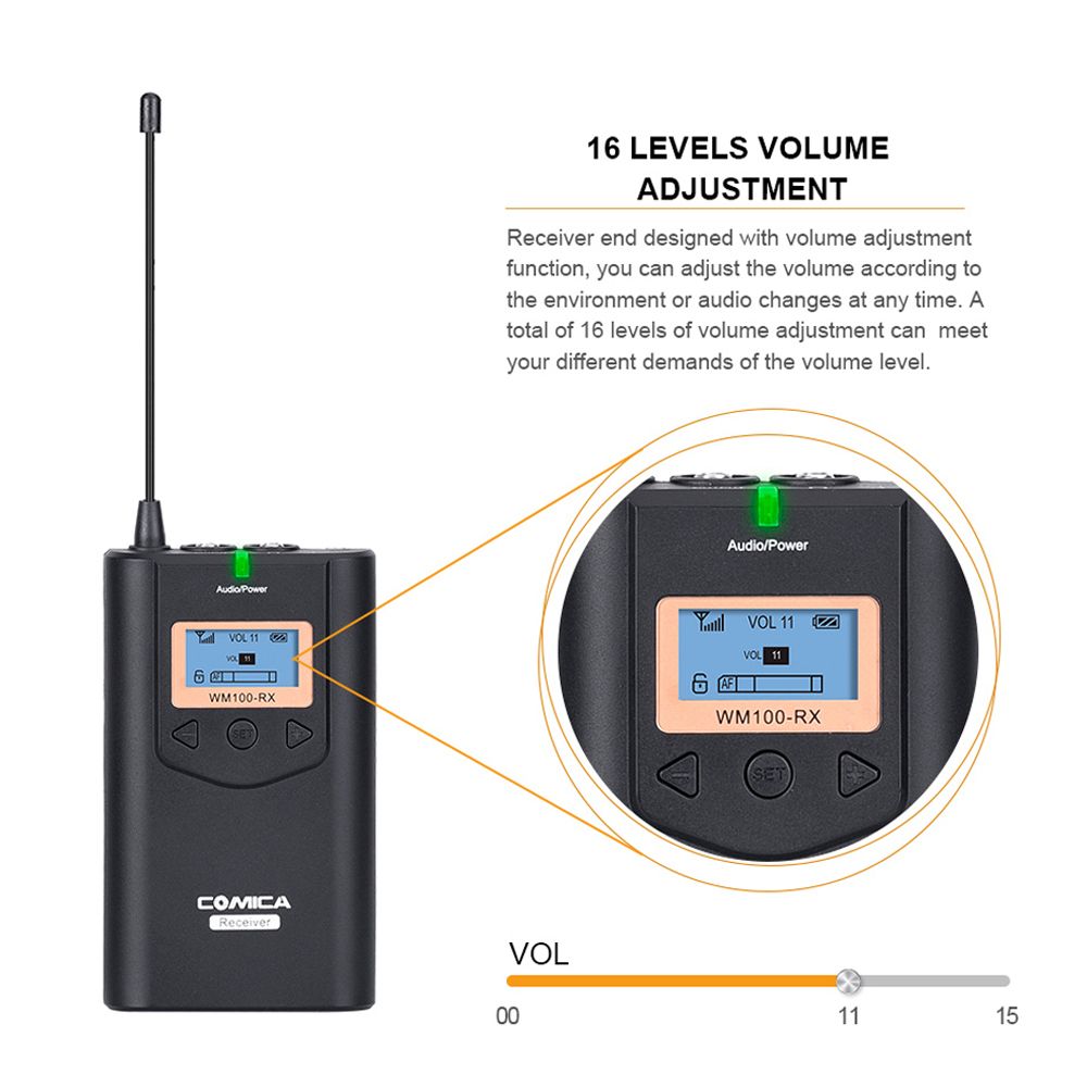 COMICA CVM-WM100H UHF wireless microphone system is a professional audio recorder for cameras & camcorders. It features 48 independent channels, up to 100m working distance, real time monitor, LCD display, adjustable RF strength, low-cut filter, 16 steps adjustable volume, mute mode, recording crystal clear sound while bringing you the best recording experience.