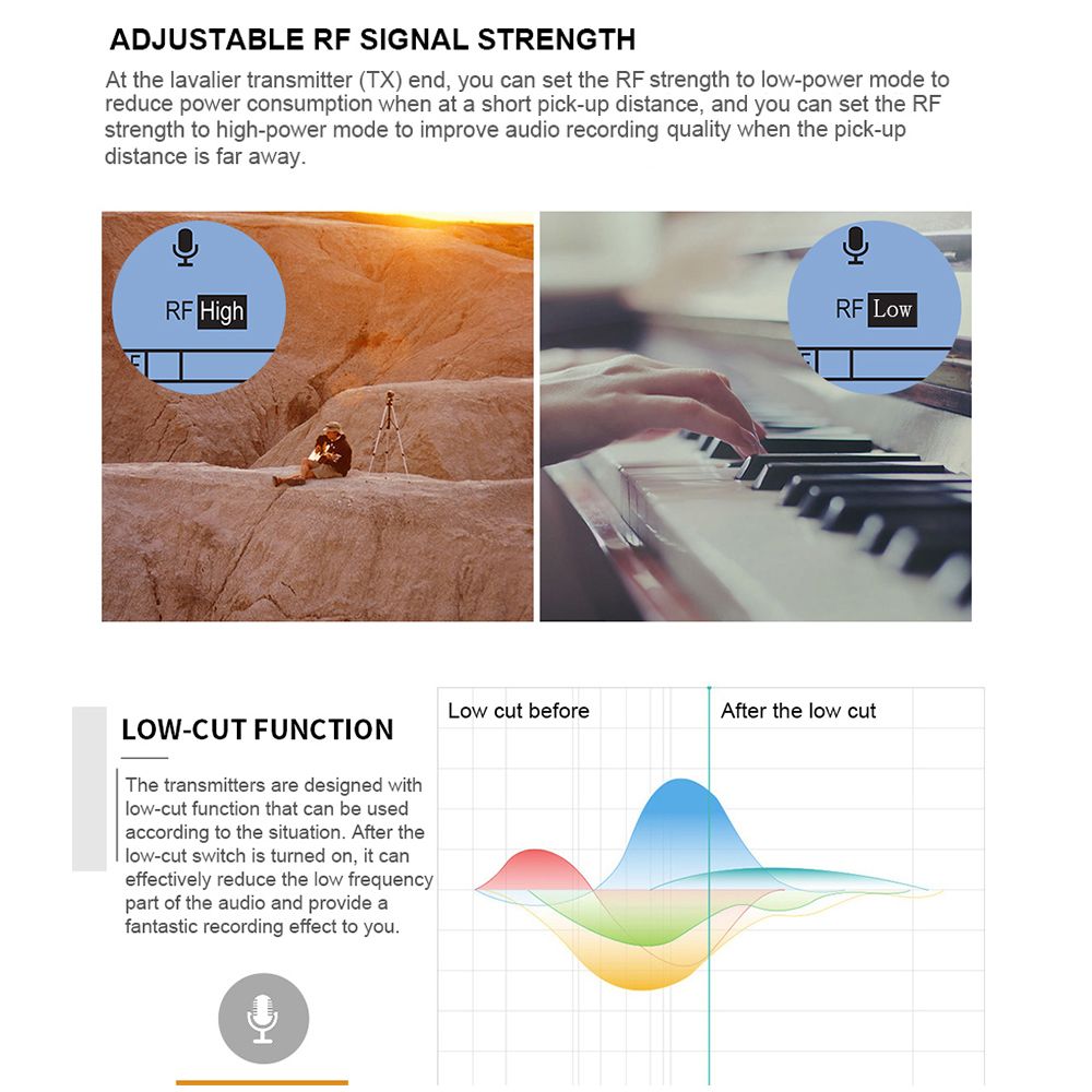 Adjust RF signal strength in transmitter end, in short pickup distance, set the low- mode to reduce consumption and prolong battery endurance, in long pickup distance, set the high- mode to improve audio quality.