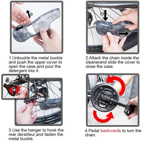 Designed for free wheel, simply attach the cleaner to the chain and use the pedal to turn the chain.