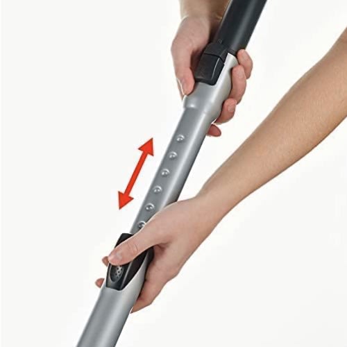 Wide range of action (8 m), 5 m cable, practical carrying handle, ergonomic handle with click connection system and anti-twist, telescopic tube, floor protected by 3 rubber wheels, storage position