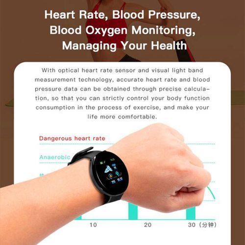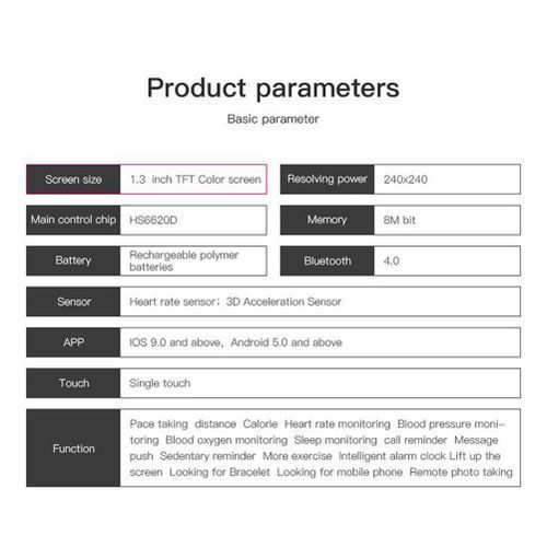 Wristwatch function1. Support Bluetooth 4.0, Android 4.4 +, IOS 8.4 +2. Touch the screen to control the wristwatch3. Steps,calorie,distance : When exercising, it can record the number of steps, the calories burned, running trajectory and the distance to the destination.4. Heart rate monitor : It will accurately monitor and record your heart rate.5. Blood pressure monitor : It will accurately monitor and record your blood pressure.6. Sleep monitor : When sleeping, it can monitor the time and quality of sleep.7. Sedentary reminder : Set the sedentary reminder time, it will vibrate to remind you to rest.8. Alarm clock9. Weather forecast10. Music Play Control11. Remote control photography : Within 10 meters, you can shake it to control the phone to take pictures.12. Message and call reminder : When the phone receives a call or a message, it will vibrate to remind you.13. 10 days standby time. Wristwatch dial:Wristwatch movement type : SmartWristwatch battery : 170 mAhWristwatch dial shap e : RectangleWristwatch display type : LEDWristwatch case material : AlloyWristwatch dial window material : GlassWristwatch dial color : Black WatchbandWatchband material : Silicone/Stainless SteelWatchband clasp type : BuckleWatchband color : Black / white / pink Size and weightWristwatch length : Approx 25 CMWristwatch dial diameter : Approx 4.1 CM X 3.4 CMWristwatch dial thickness : Approx 1 CMWatchband width : Approx 2 CMWristwatch weight : Approx 31 G PackageWristwatch X 1charging cable, X 1manual, X 1packaging box, X 1 Waterproof specification:You can wash hands and face with wearing it.But it doesn't support bathing, swimming, diving.notes: