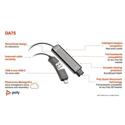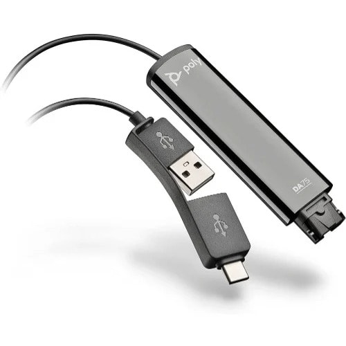 The Poly DA75 USB adapter part # Poly 218266-01 or HP 786C6AA keeps your sounding clear at home or in the office with easy USB-A or USB-C connections. Audio is adjusted to each specific headset, offering pro-grade call quality. Durable enough for 50,000 disconnects, and gentle enough to preserve your hearing, the DA75 adapter upgrades any Poly QD headset to a new standard of excellence. Flexible and future-proof, only from Poly.