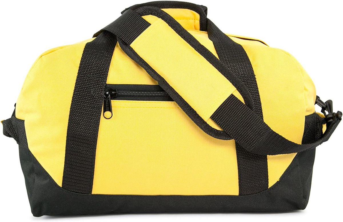 DALIX 14" Small Duffle Bag Two Toned Gym Travel Bag. This versatile bag has it all, its lightweight and comes with 13 different colors. Its Small and two toned in more color giving a vibrant feeling. Made for portability with its 14" sizing, you can bring this bag anywhere with you and not have to worry about making space for a bag. It also features a shoulder strap (with shoulder padding) for easy-carry purposes or handles with a handle clasp closure on top of the bag, and a front zipper compartment for smaller accessories such as keys, lotions, hand towels, etc. Also, a smaller side handle is available for extra support.This bag is 14" long, perfect for airplane rides, travel, luggage, and gym use. MATERIAL: Polyester. SIZE: 14" X 8-1/2" X 8-1/2" FEATURES: Zippered main compartment w/ zippered front pocket, top handle, two side handles & removable shoulder strap. COLORS: Black, Black Maroon, Dark Green, Gold, Gray, Maroon, Navy Blue, Orange, Pink, Purple, Red, Royal Blue, and White