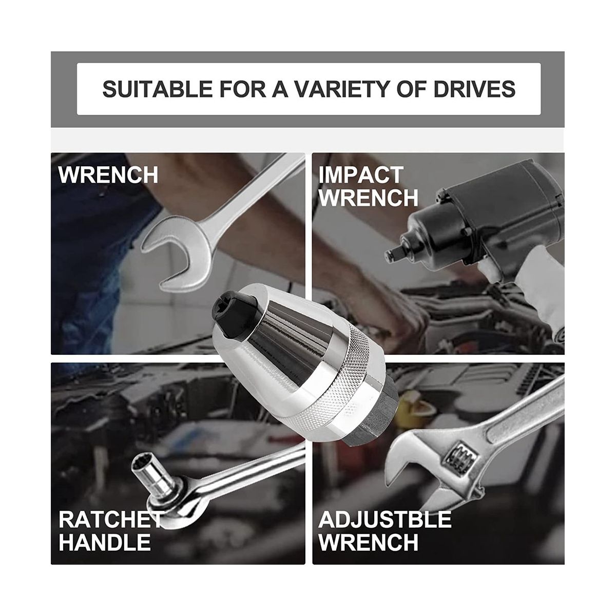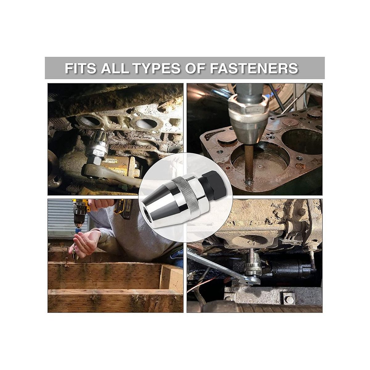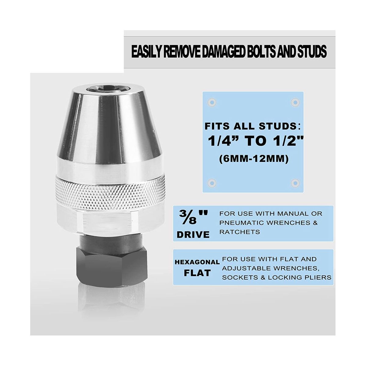 Detailed Information About The Product:This damaged stud and bolt extractor 3/8 inch drive,suitable for most drive tools:1/4 inch to 1/2 inch 6mm to 12mm),can be used with or pneumatic impact wrenches and ratchets as as adjustable wrenches and flat wrenches. Made of high-grade heat-treated alloy steel manufactured with a chrome-plated surface for extreme durability and additional rust protection.