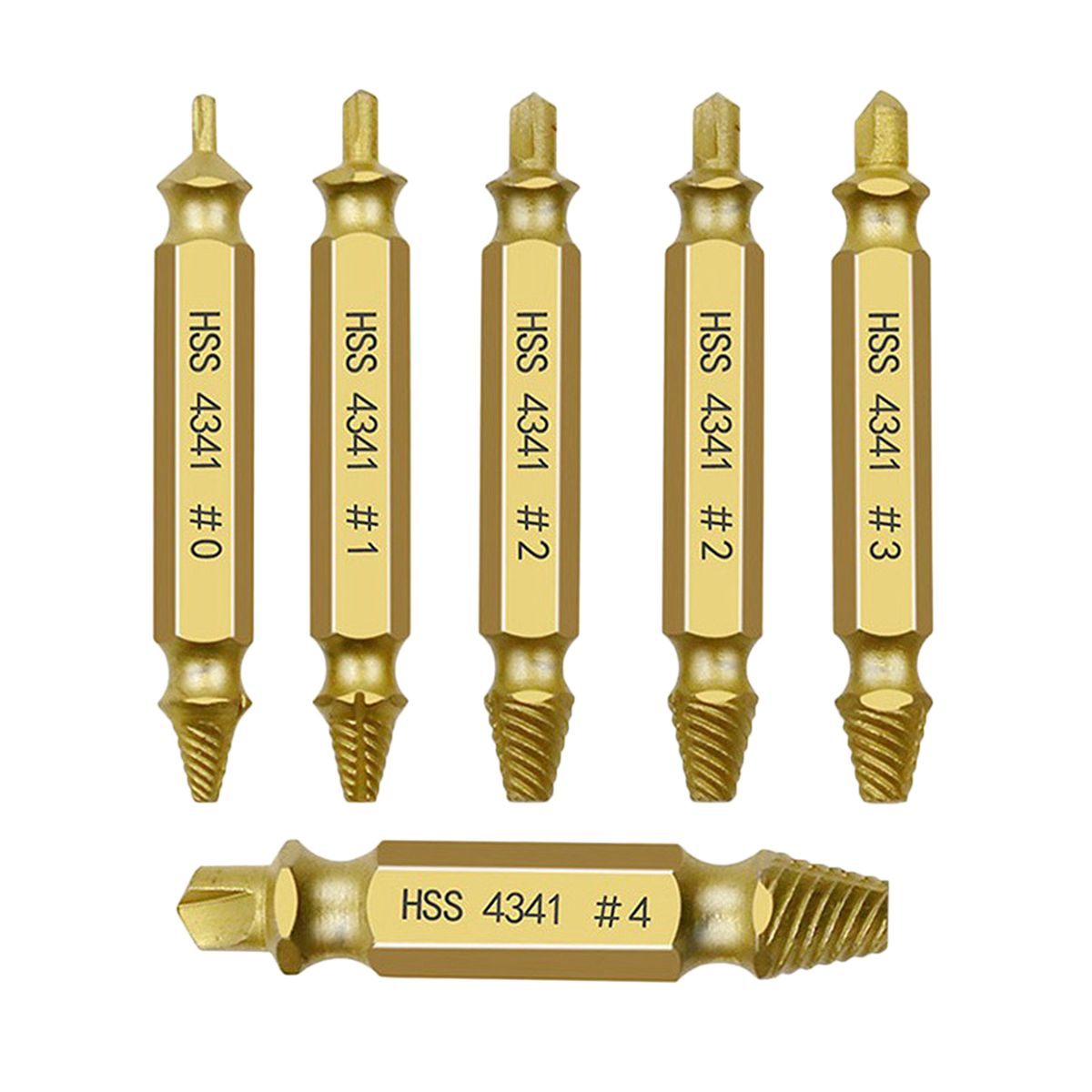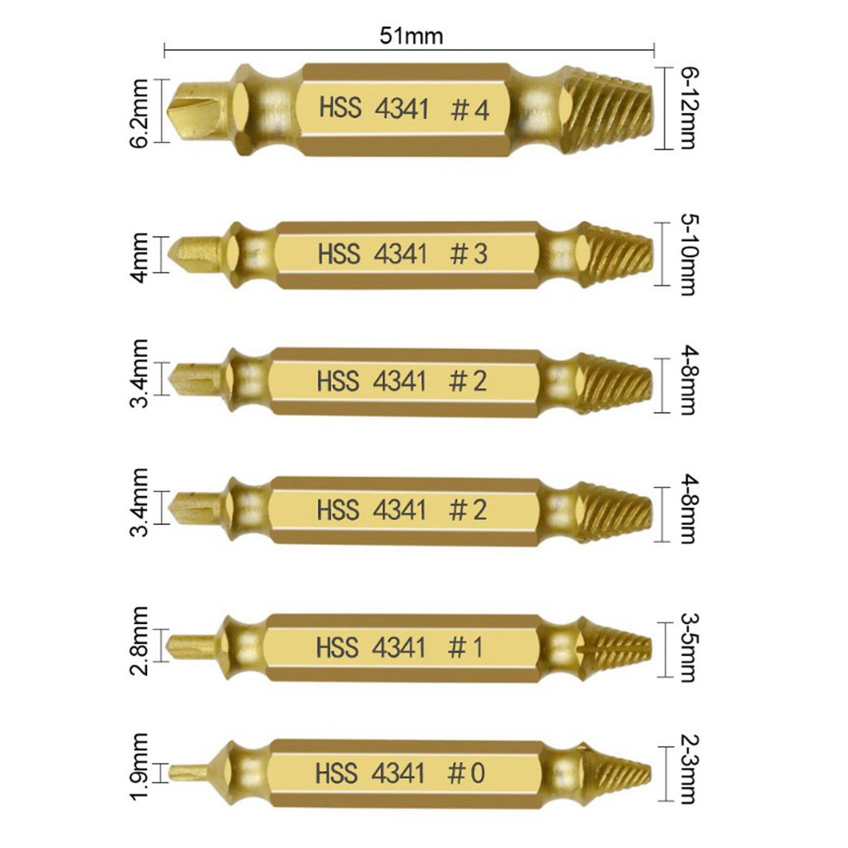 Material: HSSBit length: approx. 51mm/ 2 inchRecommended Screw Extractor for screws and bolts with diameter measuring:#0 smaller than 3/32 inch (smaller than 3mm)#1 3/32 to 3/16 inch (3mm-5mm)#2 5/32 to 5/16 inch (4mm-8mm)#3 3/16 to 13/32 inch (5mm-10mm)#4 1/4 to 15/32 inch (6mm-12mm)