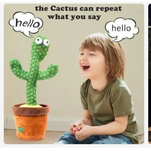 dancing cactus repeats what you say. it will record, repeat, talk, glow, wiggle, mimics, dance & sing.
