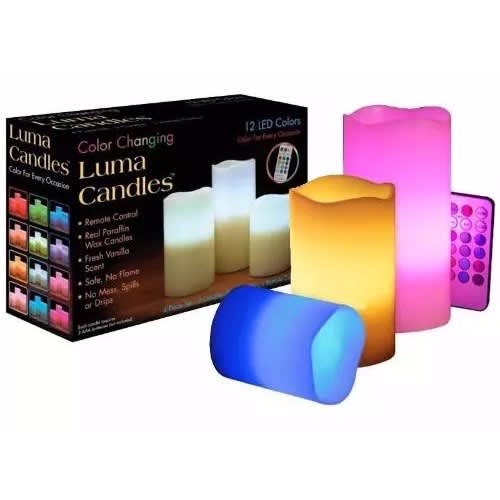 Luma Candles Real Wax Flameless Candles give you twelve illuminating color options. The multi-function remote included with your Luma Candles gives you the power to change the mood and atmosphere of any room you're in. Each LED candle requires 3 AAA batteries (not included).