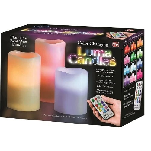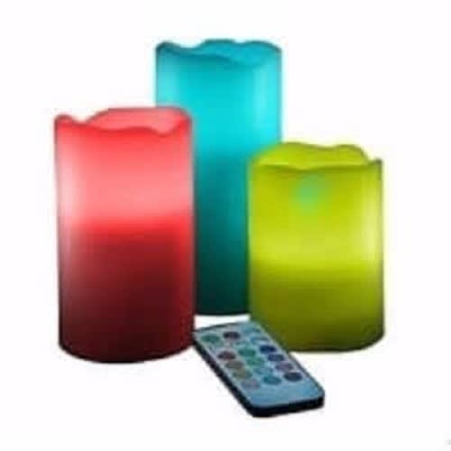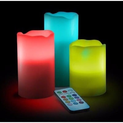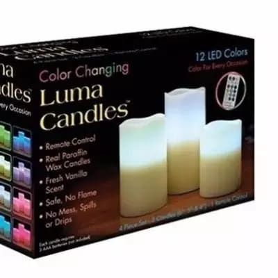 Luma Candles Real Wax Flameless Candles give you twelve illuminating color options. The multi-function remote included with your Luma Candles gives you the power to change the mood and atmosphere of any room you're in. Each LED candle requires 3 AAA batteries (not included). set of 3 flameless candles features a 4 or 8 hour timer as well as a remote control. Enjoy real wax candles without the messy wax and dangerous flames, and the convenience of the remote control. Flameless candles are safe to use with children and pets as well as near curtains, beds and other home furnishings. The remote control lets you use the flameless candles in hard to reach areas such as tall shelves or even chandeliers.
