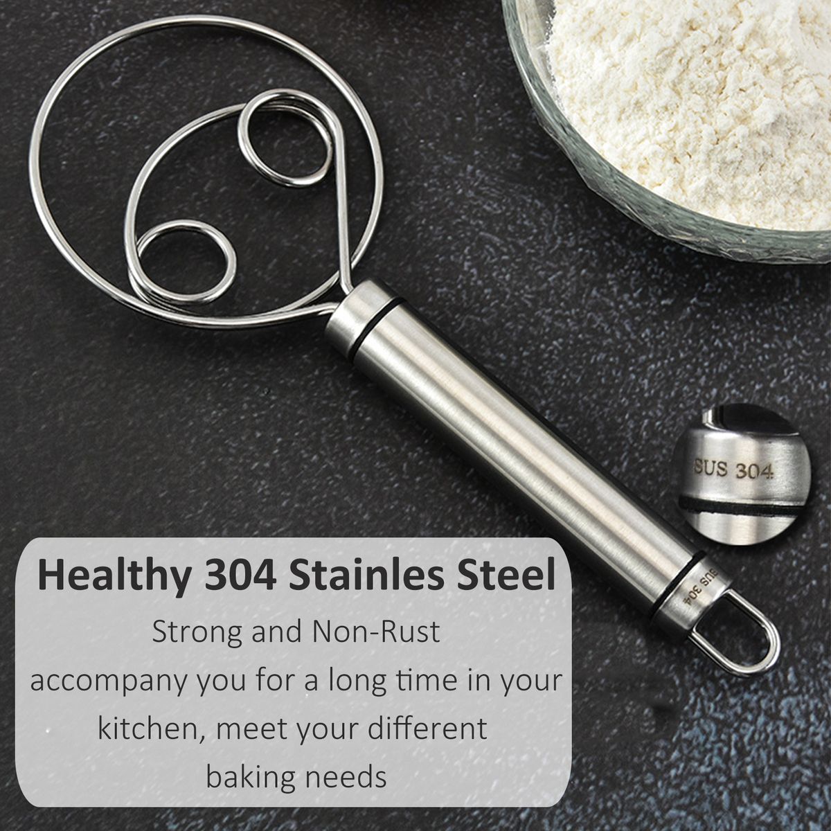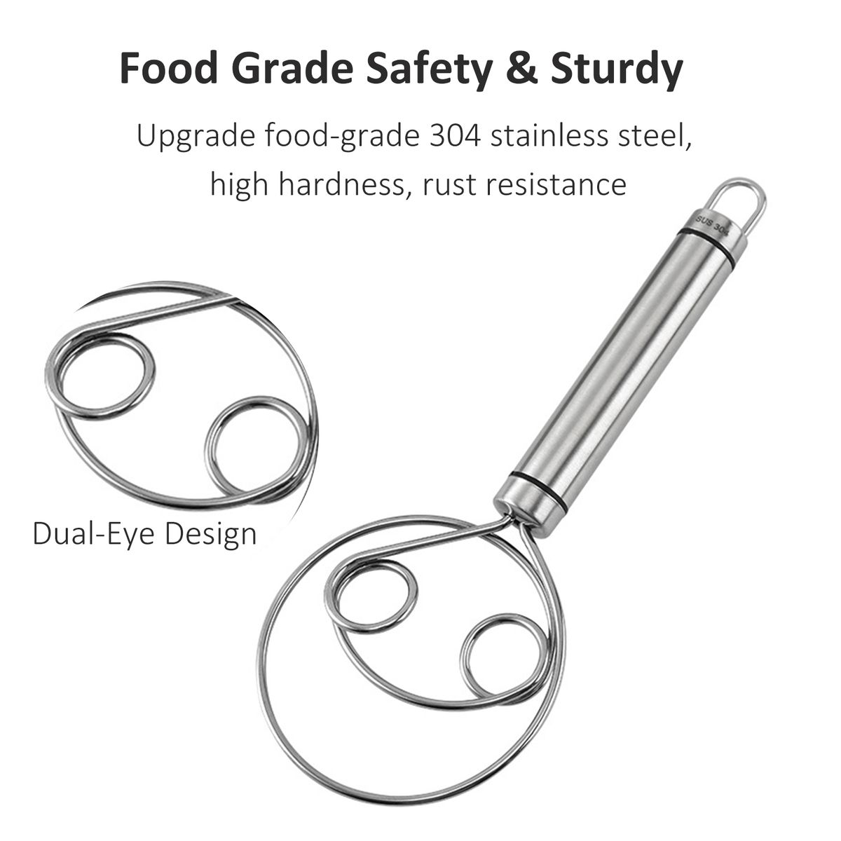Food Grade Safety amp; Sturdy -- Made of high-quality food grade 304 stainless steel the dough whisk is non-toxic, strong, rust-proof and durable for lifetime using. And it is safety to be used by both kids and adults on an everyday basis.