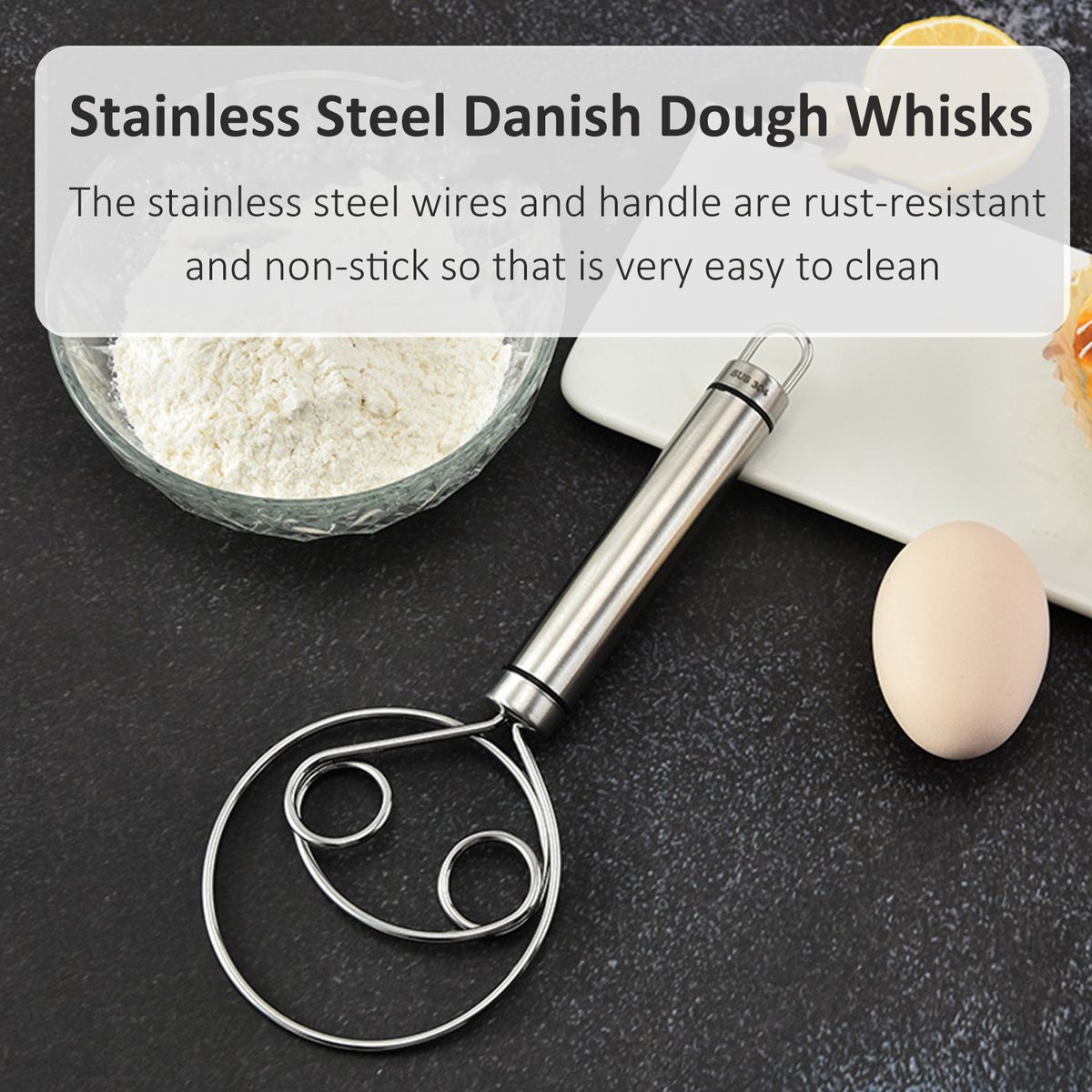 Easy to Clean -- Mirror polished danish whisk without any gap between the wire head and the handle, easy to release your dough without leaving food residue, easy to clean and store for next time use.