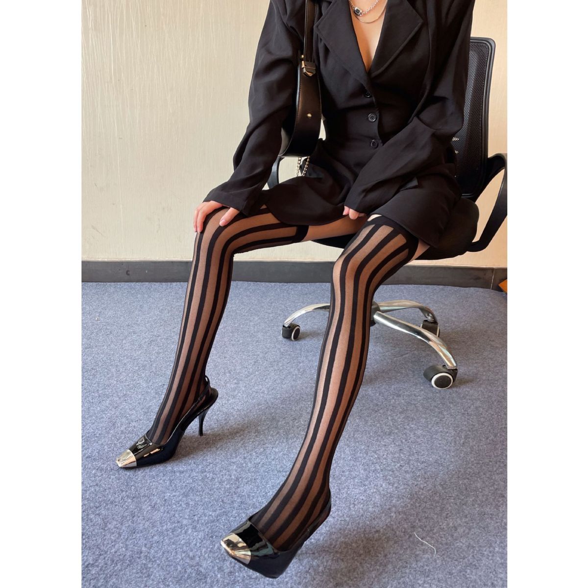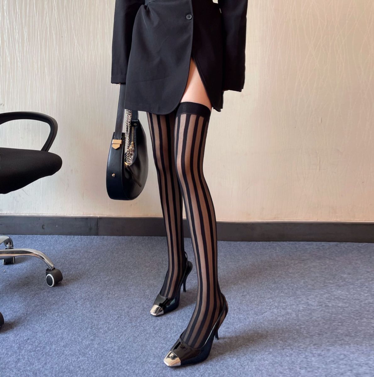 1X Dark Vertical Stripe Black Silk Jacquard Stretch High Hose Japanese Street Patter JK Uniform Thigh Socks Over Knee Silk Stocking