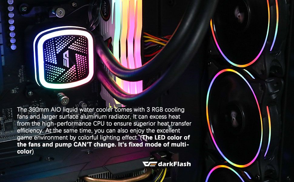 AIGO integrated water cooling,maintenance-free, no need to add water and cold liquid for life. 12 cm temperature controlled intelligent aurora RGB color changing fan, with N.I.T. noise interception technology, all-round mute design. Ceramic bearings. Constant light. Flashing. All pure copper hot water absorption cold head, fit the CPU to fully absorb heat. 27mm aluminum radiator,High-density wave band cold row,using S-shaped fins, increase the heat dissipation area. Provides all platform mounting clips for INTER and AMD CPUs and is easy to install. Woven mesh high quality rubber water cooled tube, zero penetration, durable and durable. Efficient heat dissipation, brilliant light efficiency, highly translucent 3D collapse cold head design.
