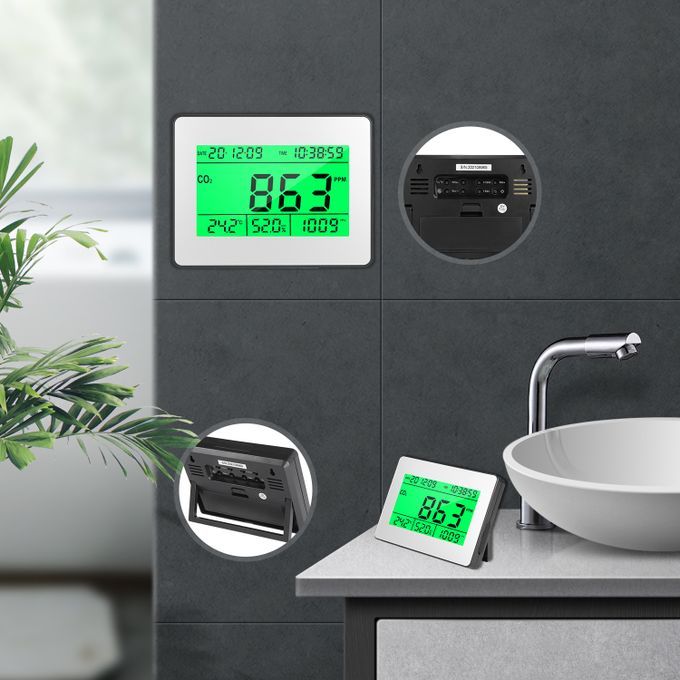 of warning carbon dioxide level, large LCD with backlight, maximum, minimum reading display, data hold function, low battery indicator, wall-mounted and desktop design, auto -off, reading internal memory (data record function), etc.