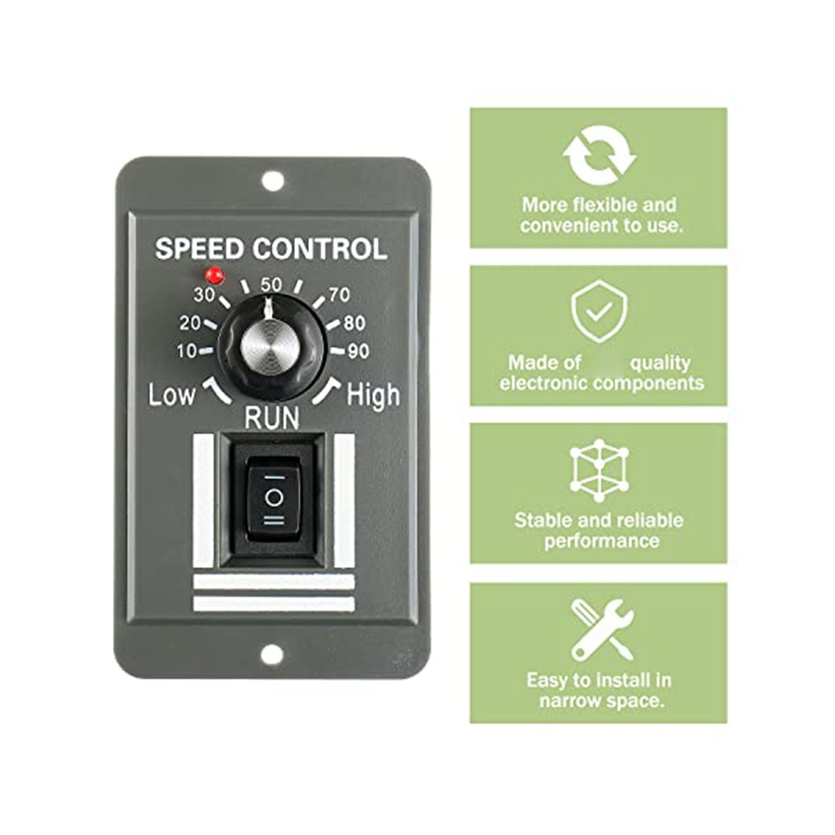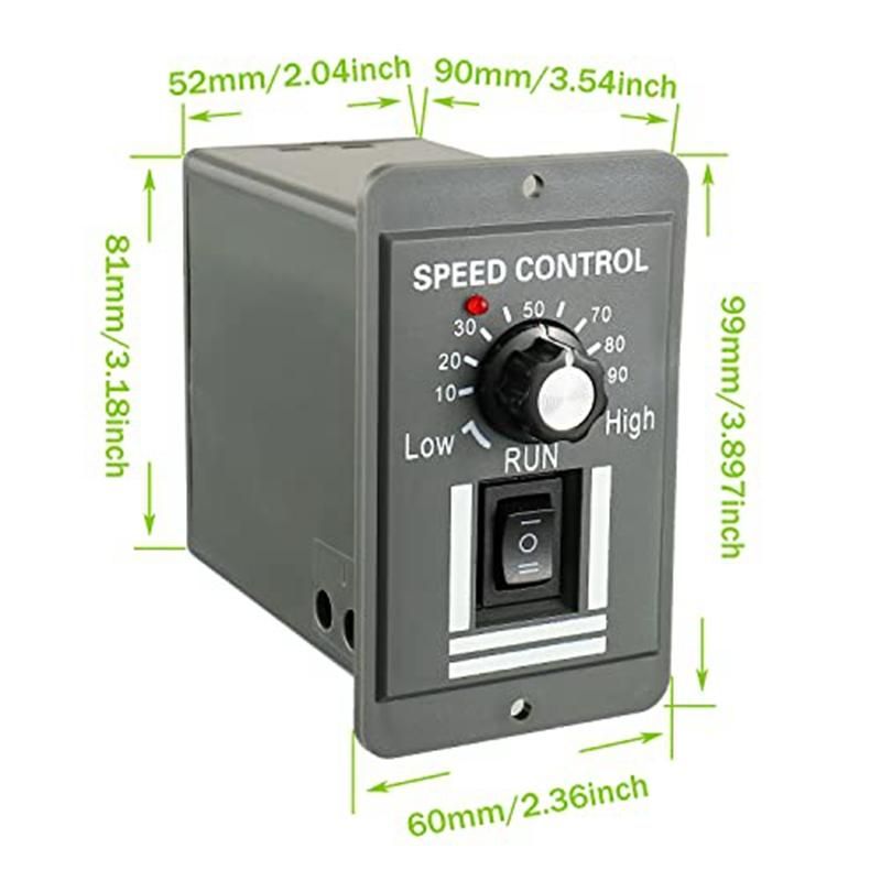 Size 60x90x99mm236x354x39in LxWxH the DC motor speed controller is small in size installation size 52x81mm205x319in convenient for installation in narrow spaces turn control and stop