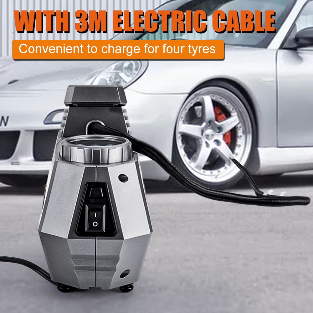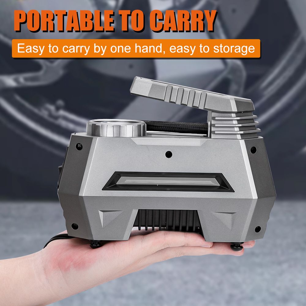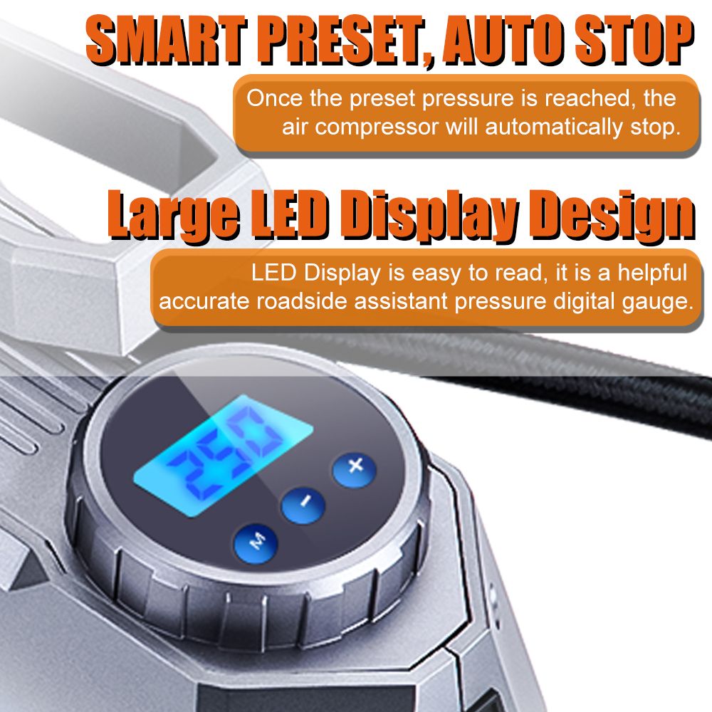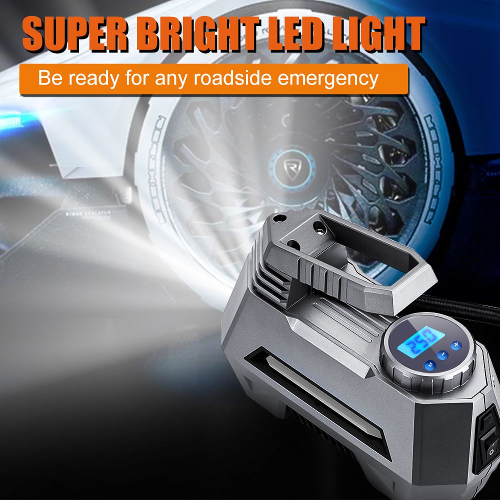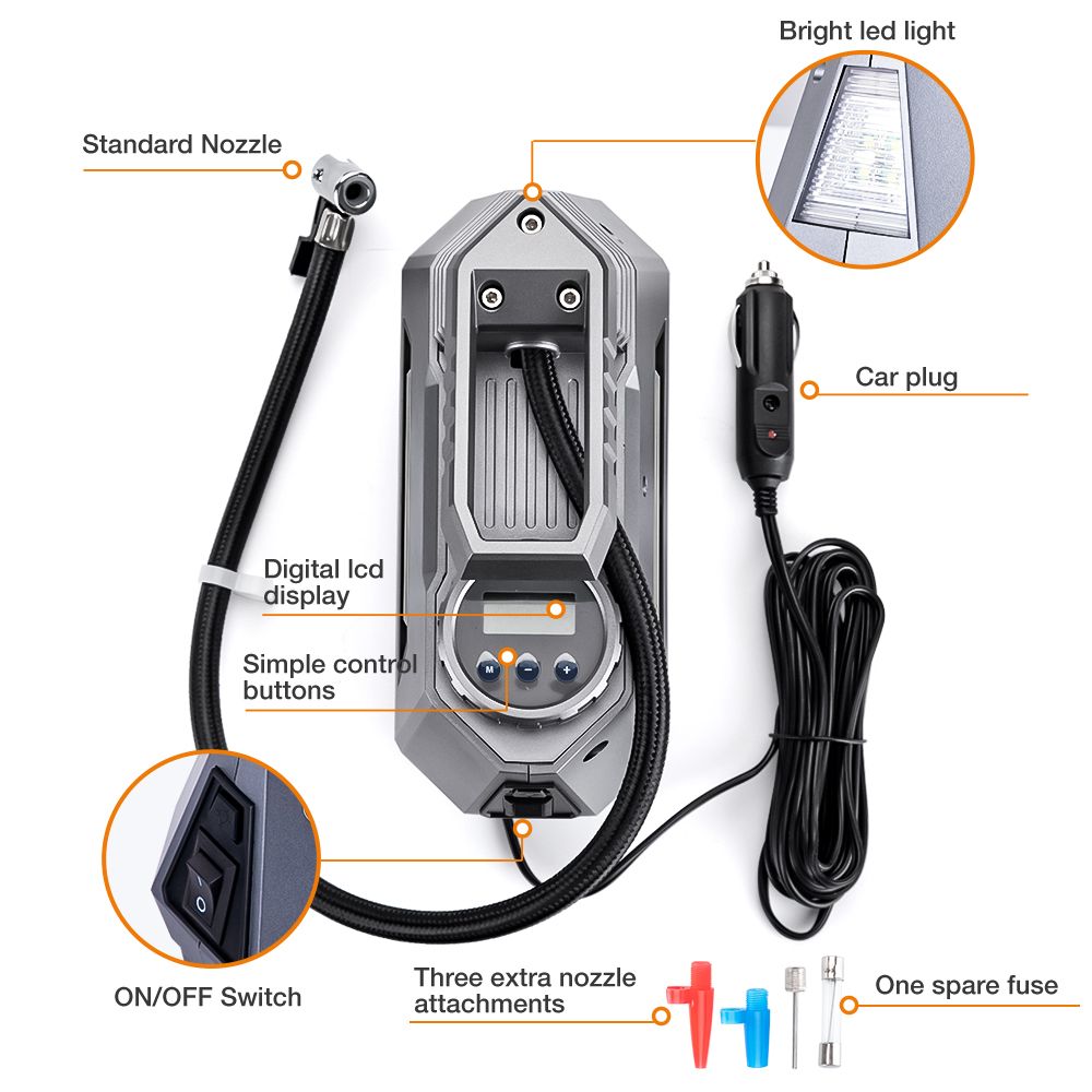 Feature: * Fast inflation and advanced accuracy: This tire inflator uses high-quality materials and can inflate 195/55/R15 car tires at a pump preure of 35 liters/minute in 5 minutes. Profeional calibration, always return the reading within 1.5% of the tire preure. Please note that after 10-15 minutes of continuous use, let the air compreor stay and cool down for the equivalent time before continuing to use it. * Programmable inflation: use the "M" on to set the desired preure unit, and then pre the "+" and "-" ons to set the desired preure. The air compreor will automatically shut down when it reaches the preset preure (please make sure that the preure you set is higher than the current preure of the tire). * Product highlights: One-click to change the preure unit of PSI, KPA, BAR and KG/CM2; large backlit LCD screen, easy to read even in the dark; equipped with a built-in LED flashlight, equipped with independent switch control device, with For emergency use; 12V 120W 10 feet (3 meters) long heavy-duty car cigarette power cord, easy to use; the compreor can be easily stored in the car or garage, and can be used at any time. * Wide range of uses: 3 nozzles and additional fuses are included. Inflate any Schrader valve in cars, SUVs, motorcycles, bicycles, and scooters; included acceories can quickly inflate balls, air cushions, cushions, balloons, and mattrees. Note: This pump is not suitable for high-preure or high-volume applications; such as swimming pools and inflatable canoes. Specification: Item Type: Electric car air pump Color: grey Material: Plastic Body + Copper Motor Working Voltage: DC 12V Power Supply: Cigarette Working Current: ≥ 10A Rated Power: 120W Flow Rate: 35L / min Maximum Preure Value: 150PSI Display Units: KPA,PSI,BAR,KG/ CM² Type: Car Tire Inflator Power Cord Length: 10ft(3 meters) Hose Length: 2ft Continuous Operating Time: 10 Minutes Maximum Special Feature: Digital or pointer display screen Size: 20.4*15.7*8.9cm Item Weight: 0.8KG Package content: 1 * Tyre Inflator Pump 1 * Backup Fuse 3 * Nozzle Adaptor