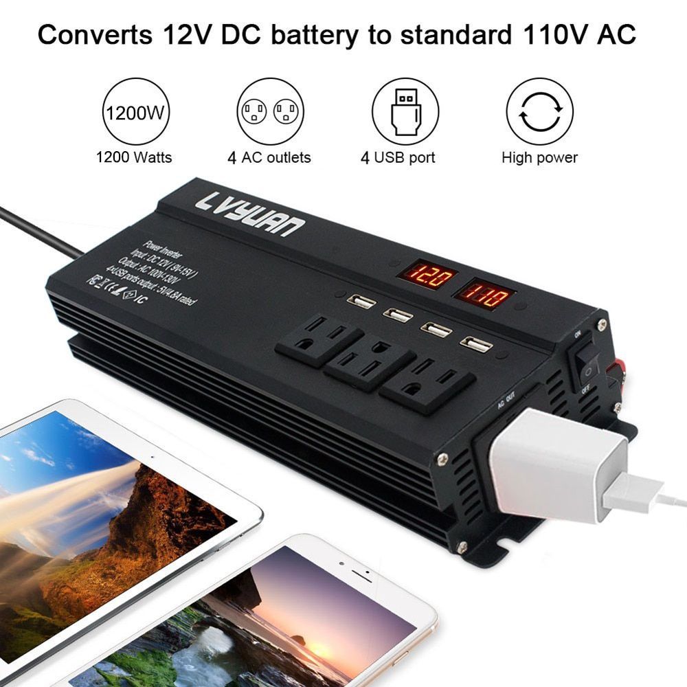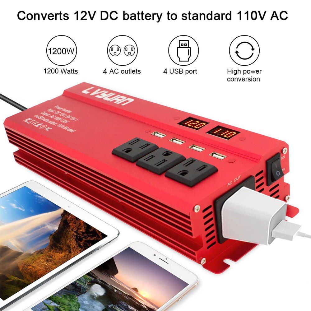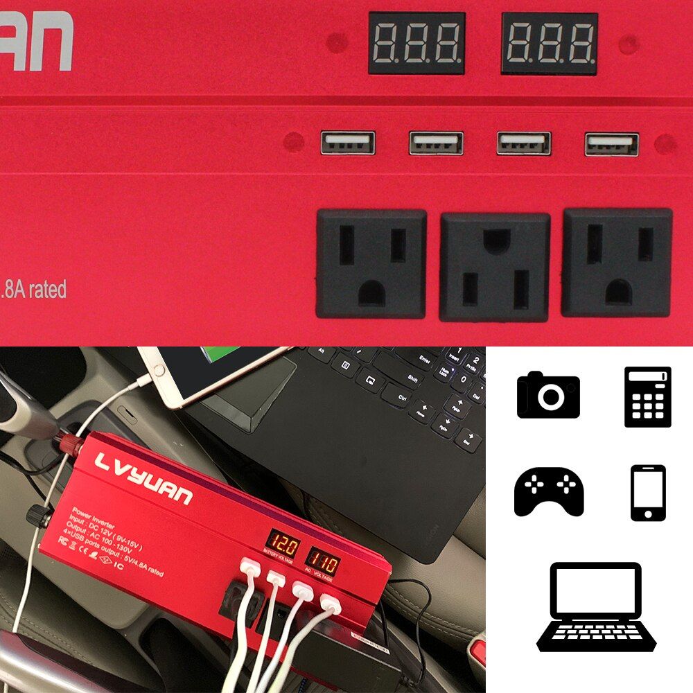 1X DC 12V To 110V 60 HZ US 3AC Outlets 4 USB Power Inverter Fast Charger Ipone Laptop LED Display Inverter Camping Inverter