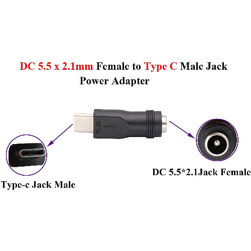 C TyPE connectorBrand New and High QualityDC Power 5.5x2.1mm Female Jack to USB-C Male Plug AdapterColor: Black+SilverOutside Diameter: 5.5mm/0.22Inside Diameter: 2.1mm/0.083Length 40mm