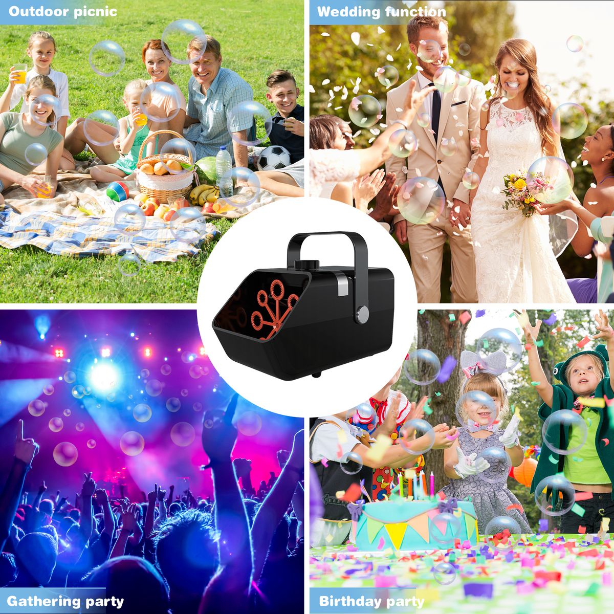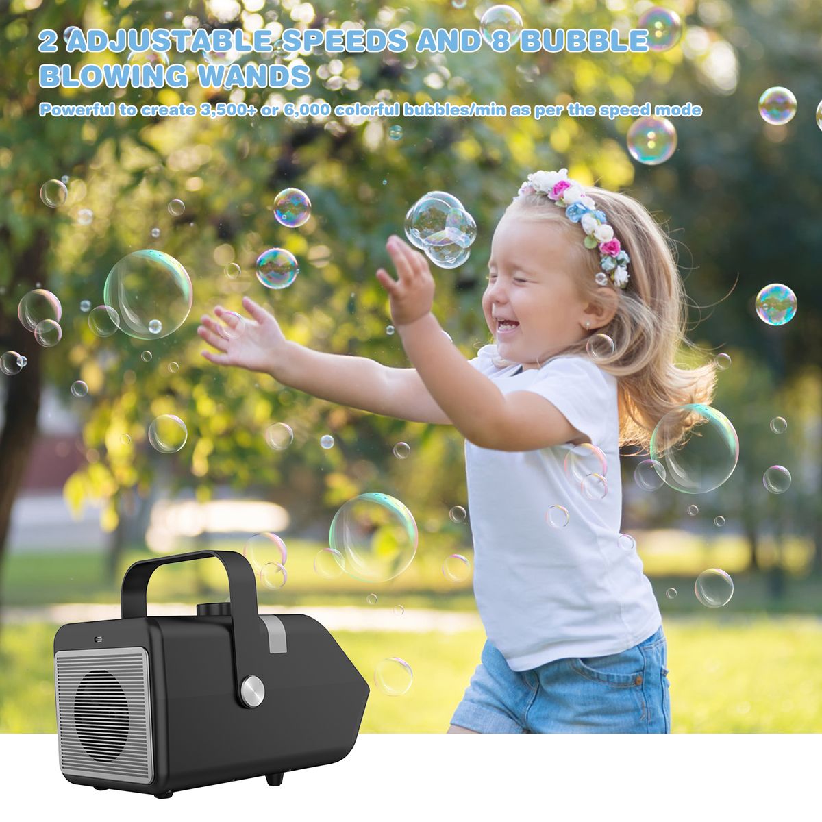 The bubble machine has 2 adjustable speeds and 8 bubble blowing wands, powerful to create 3,500+ or 6,000 colorful bubbles/min as per the speed mode you operates.