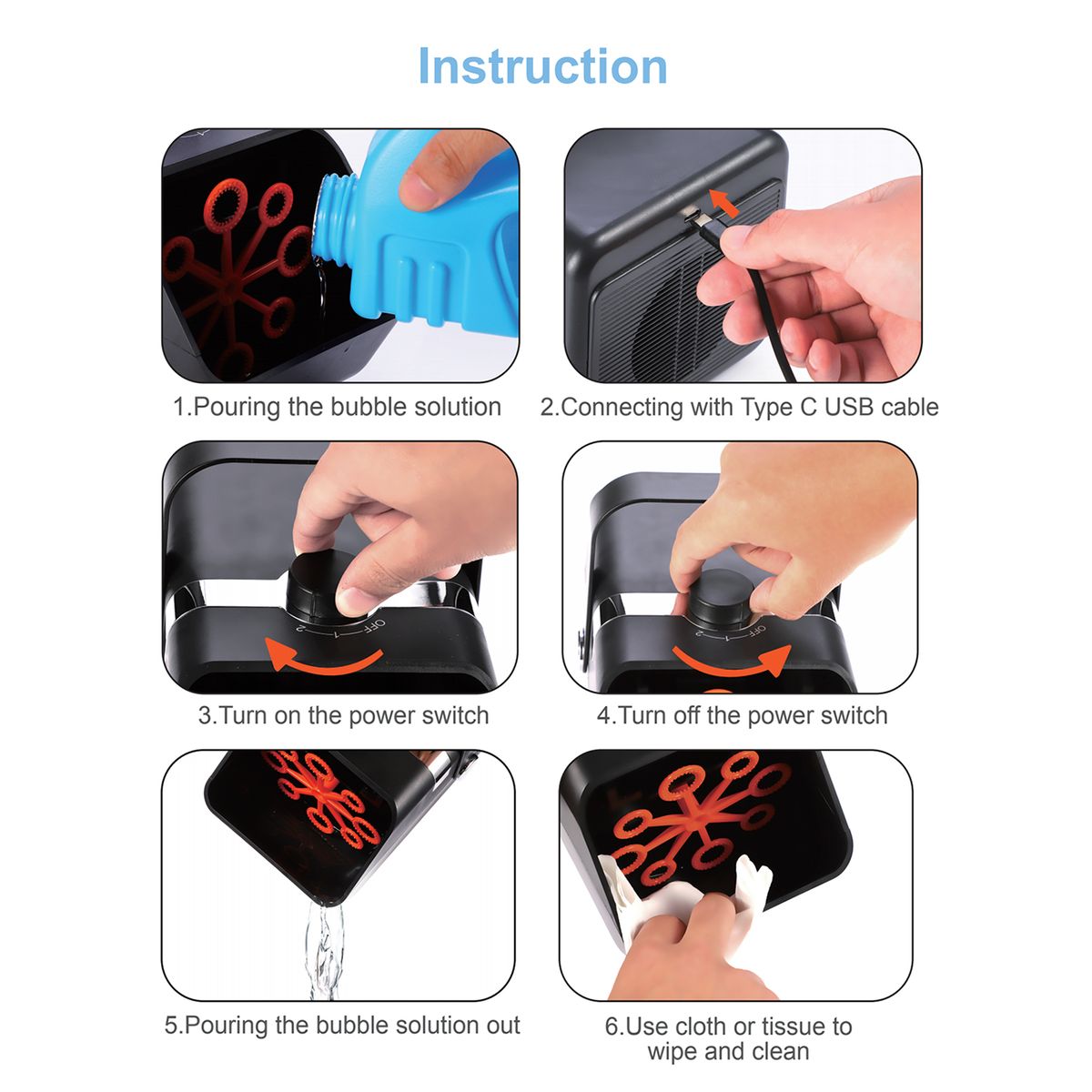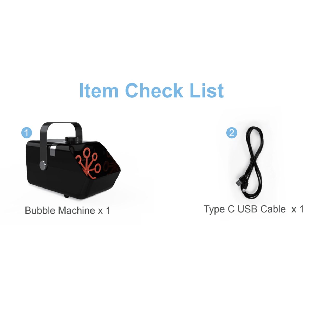 1 x Bubble Machine,1 x English User Manual,1 x USB Cable
